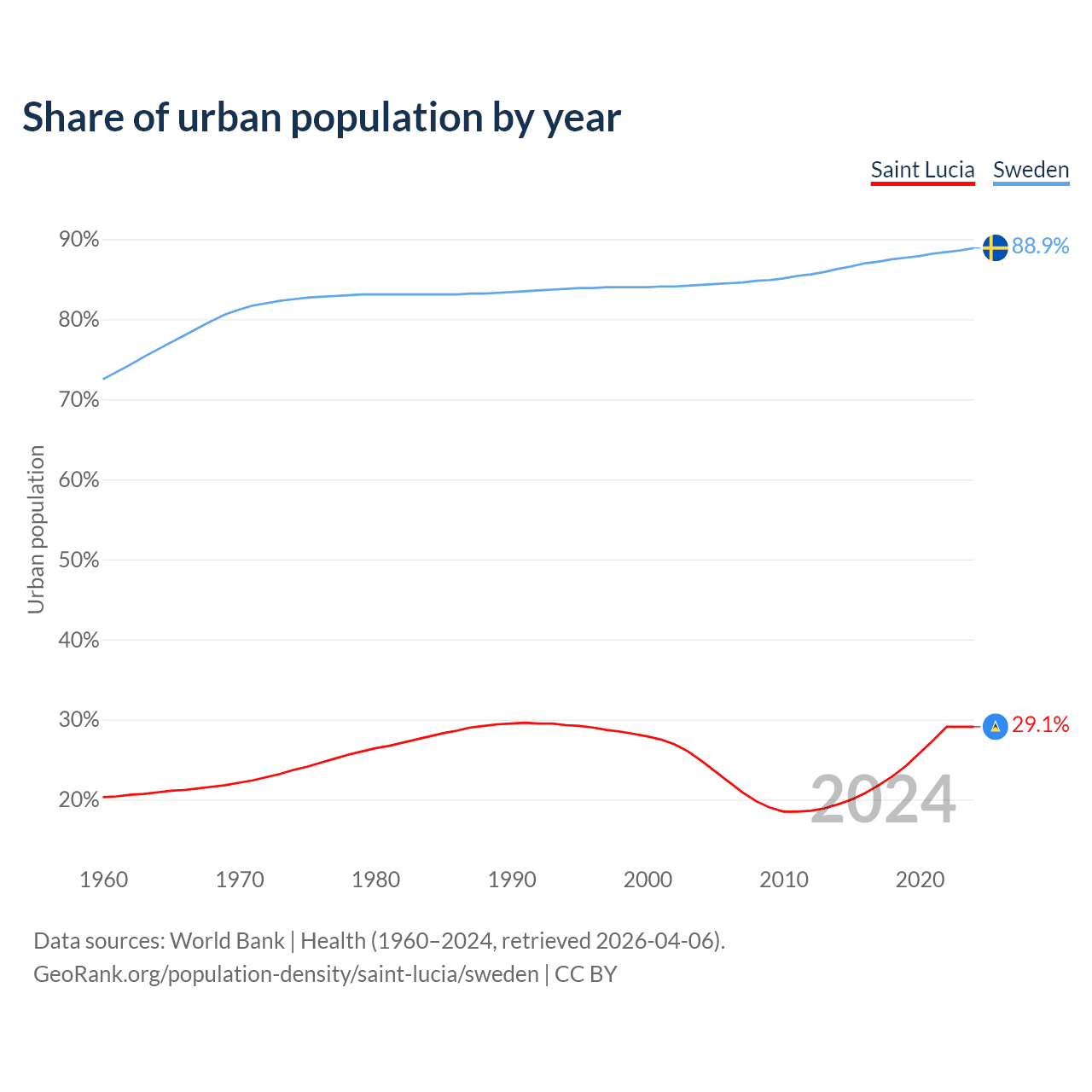 From 2004 to 2024, the share of urban population changed from 24.8% to 29.1% in Saint Lucia and from 84.3% to 88.9% in Sweden.