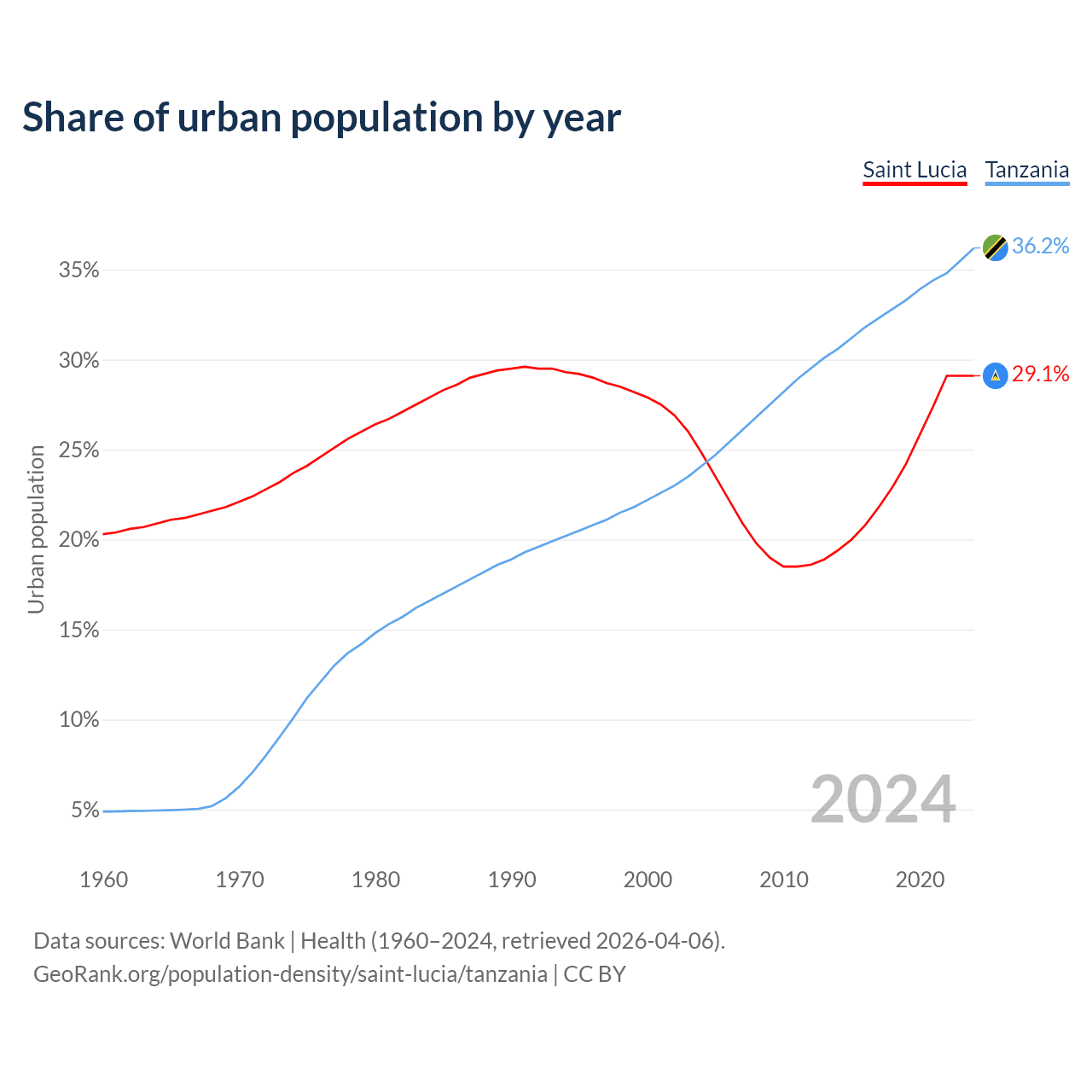 From 2004 to 2024, the share of urban population changed from 24.8% to 29.1% in Saint Lucia and from 24.1% to 36.2% in Tanzania.
