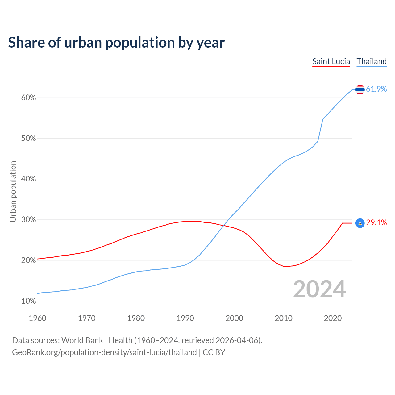 From 2004 to 2024, the share of urban population changed from 24.8% to 29.1% in Saint Lucia and from 36.8% to 61.9% in Thailand.
