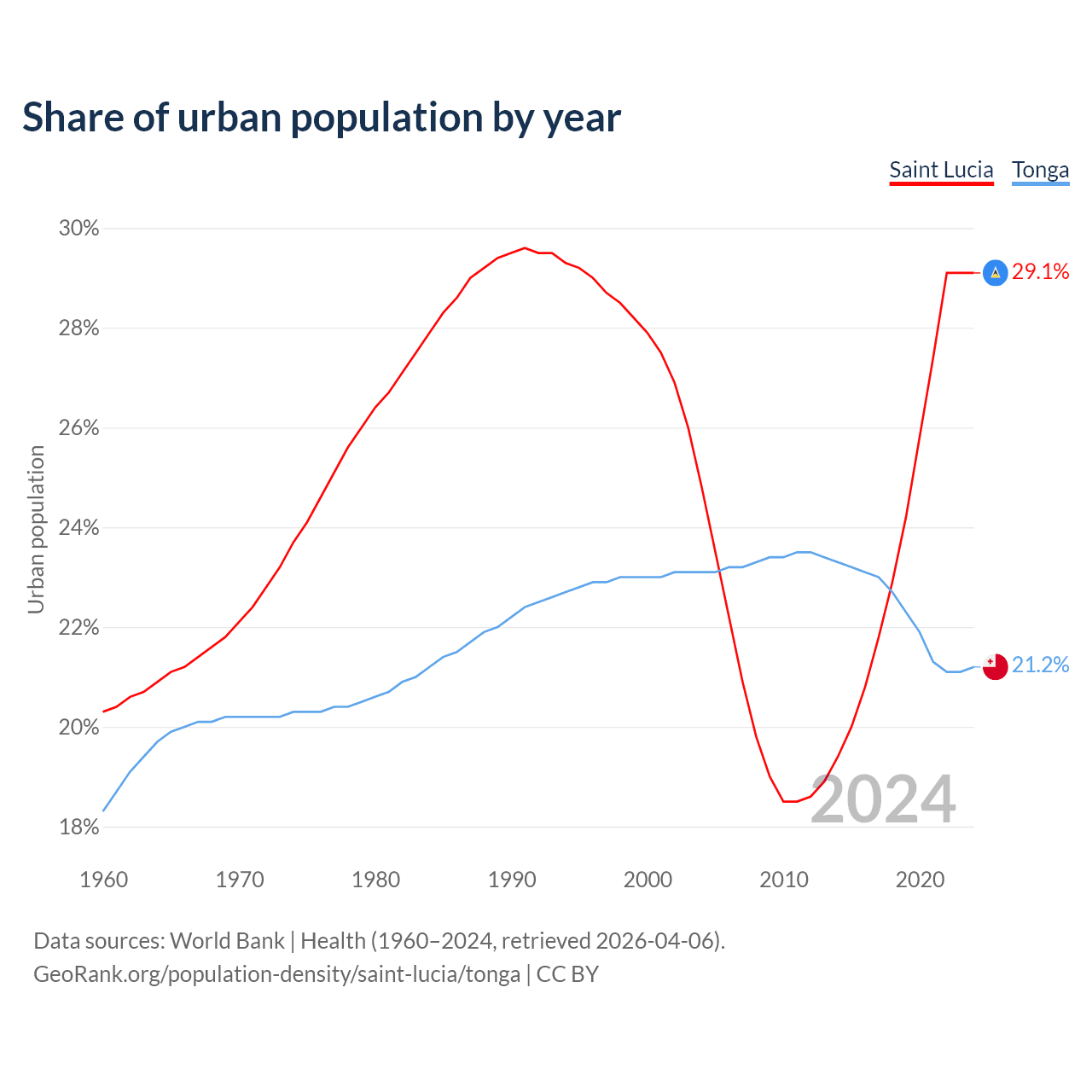From 2004 to 2024, the share of urban population changed from 24.8% to 29.1% in Saint Lucia and from 23.1% to 21.2% in Tonga.