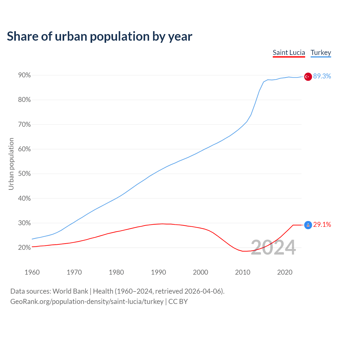 From 2004 to 2024, the share of urban population changed from 24.8% to 29.1% in Saint Lucia and from 62.4% to 89.3% in Turkey.