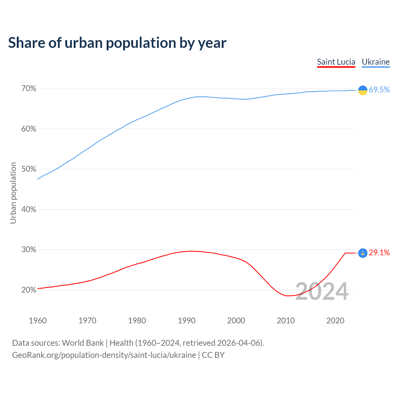 From 2004 to 2024, the share of urban population changed from 24.8% to 29.1% in Saint Lucia and from 67.6% to 69.5% in Ukraine.