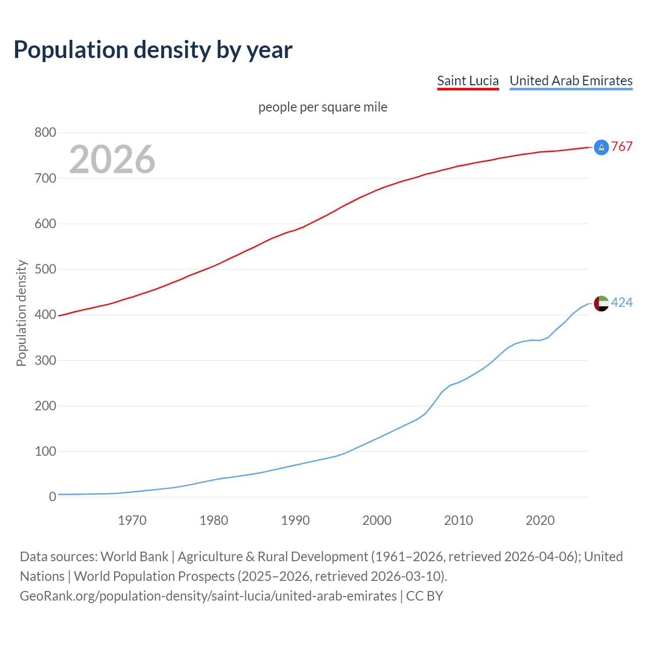 From 2006 to 2026, population density in Saint Lucia increased by 8.35%, compared to a 132.2% growth in the United Arab Emirates.