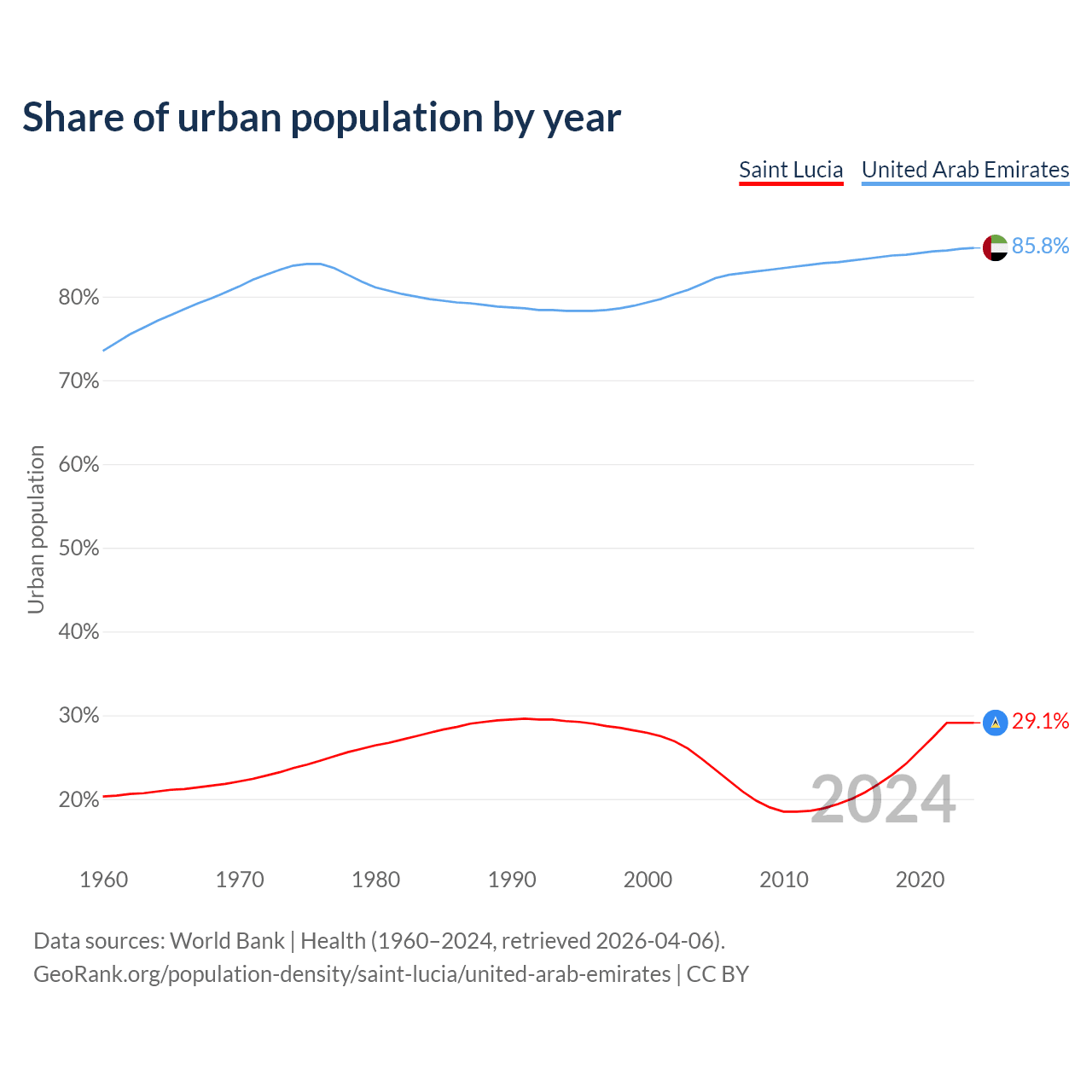 From 2004 to 2024, the share of urban population changed from 24.8% to 29.1% in Saint Lucia and from 81.5% to 85.8% in the United Arab Emirates.