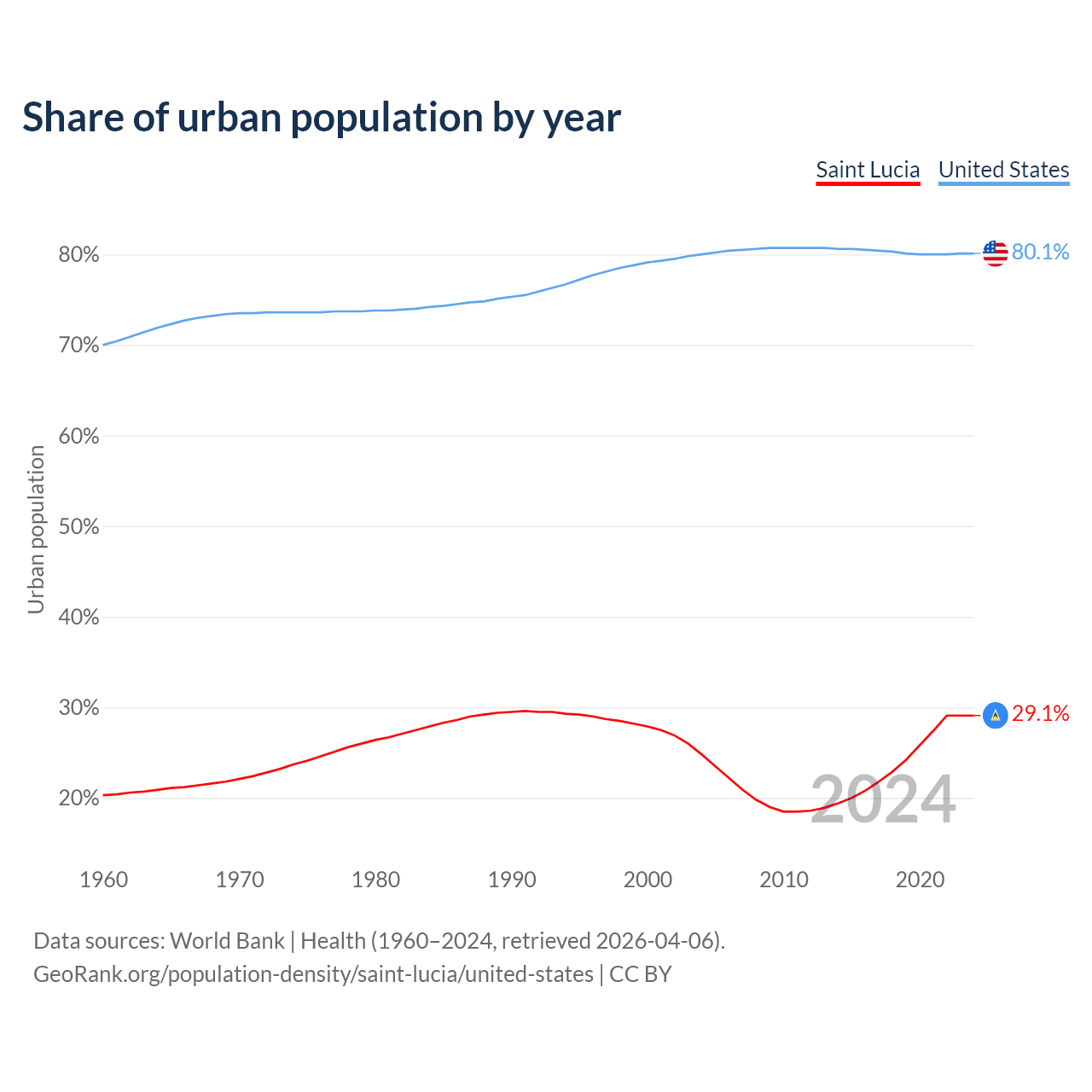 From 2004 to 2024, the share of urban population changed from 24.8% to 29.1% in Saint Lucia and from 80% to 80.1% in the United States.