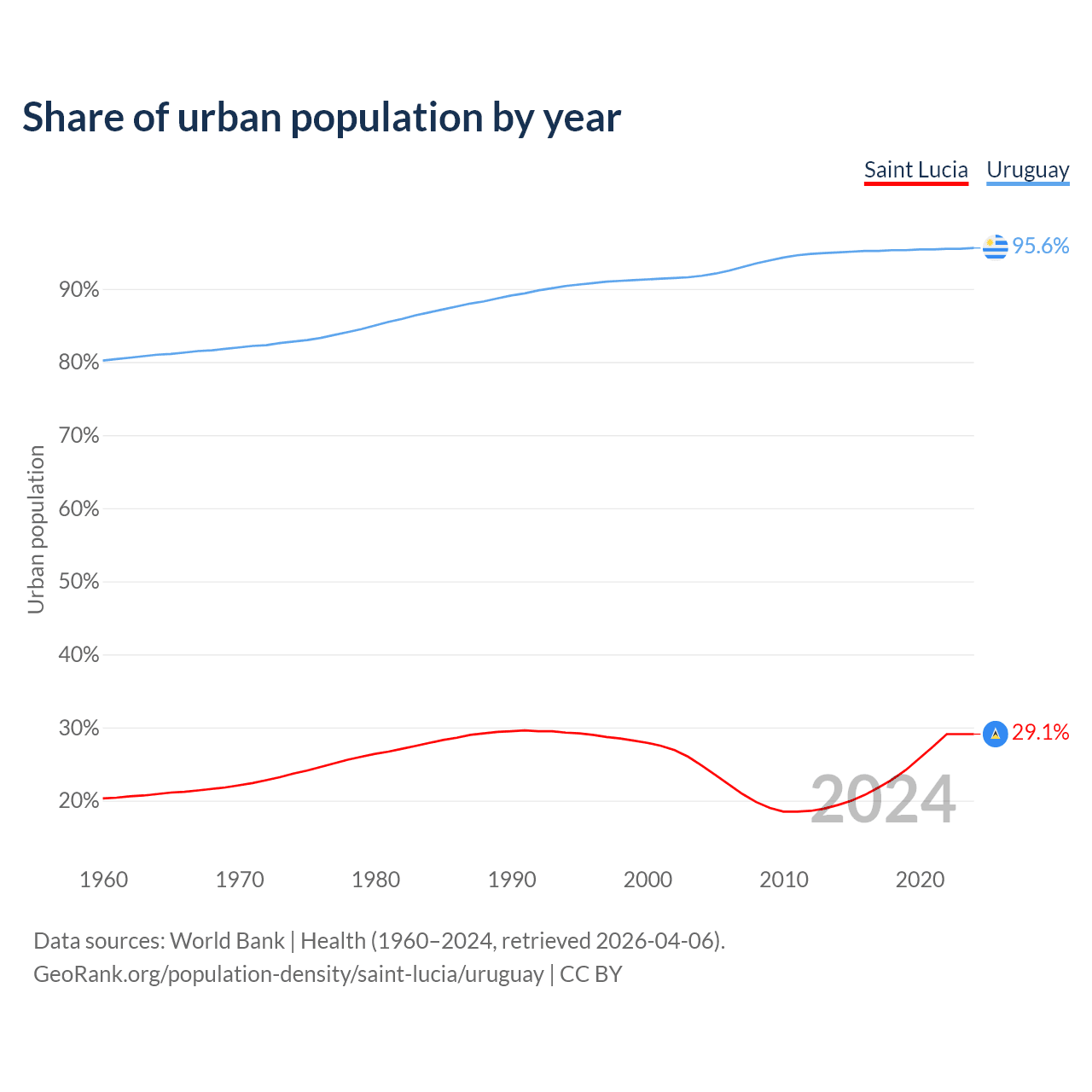 From 2004 to 2024, the share of urban population changed from 24.8% to 29.1% in Saint Lucia and from 91.8% to 95.6% in Uruguay.