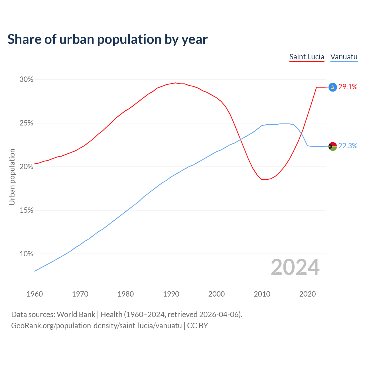 From 2004 to 2024, the share of urban population changed from 24.8% to 29.1% in Saint Lucia and from 22.7% to 22.3% in Vanuatu.