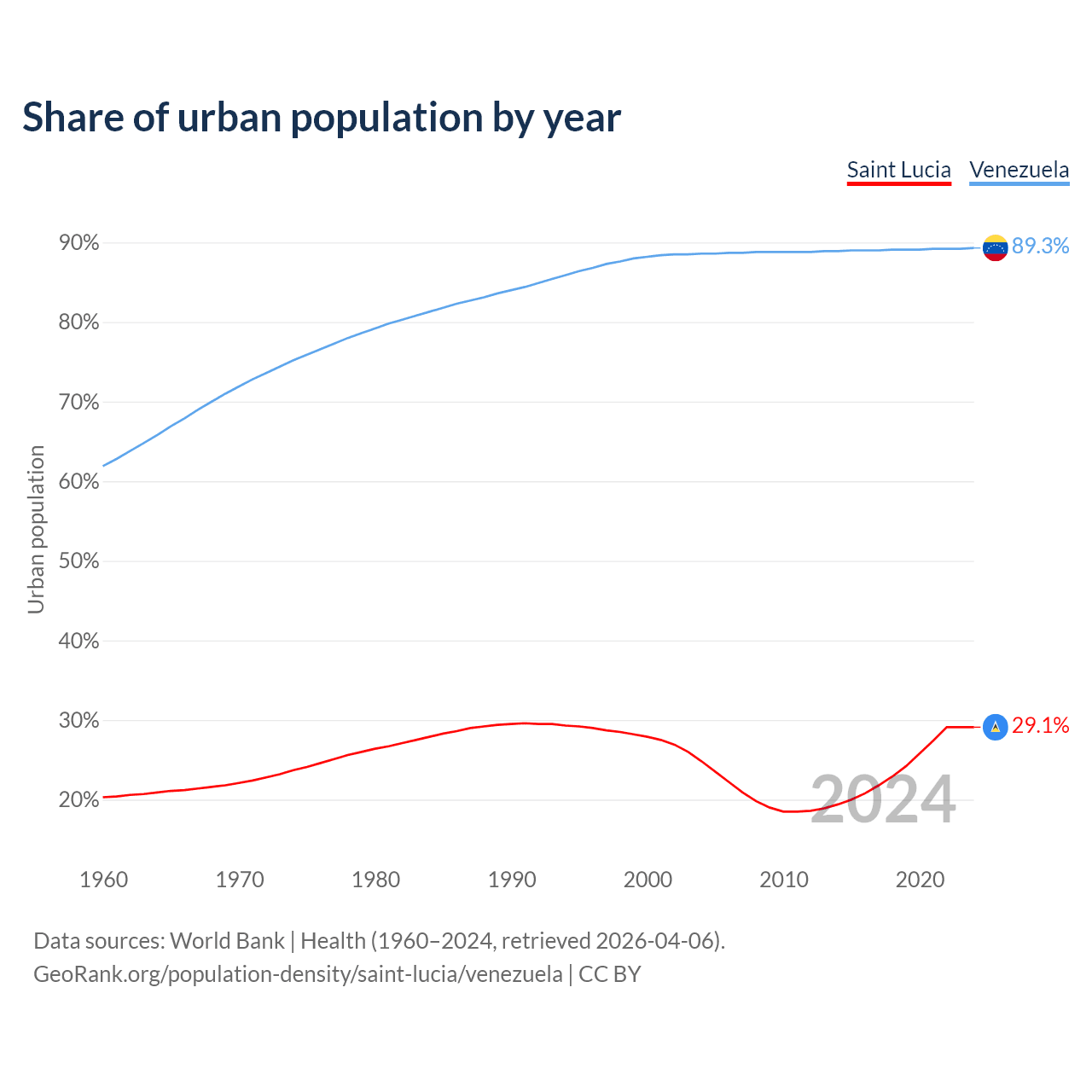 From 2004 to 2024, the share of urban population changed from 24.8% to 29.1% in Saint Lucia and from 88.6% to 89.3% in Venezuela.