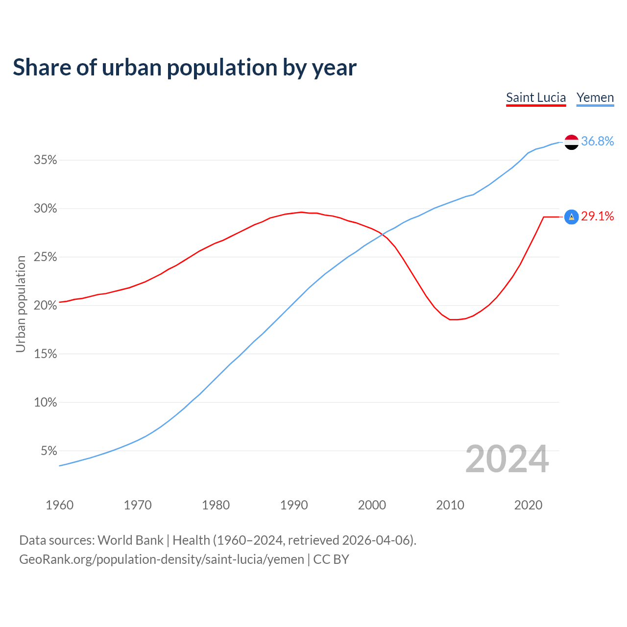 From 2004 to 2024, the share of urban population changed from 24.8% to 29.1% in Saint Lucia and from 28.5% to 36.8% in Yemen.