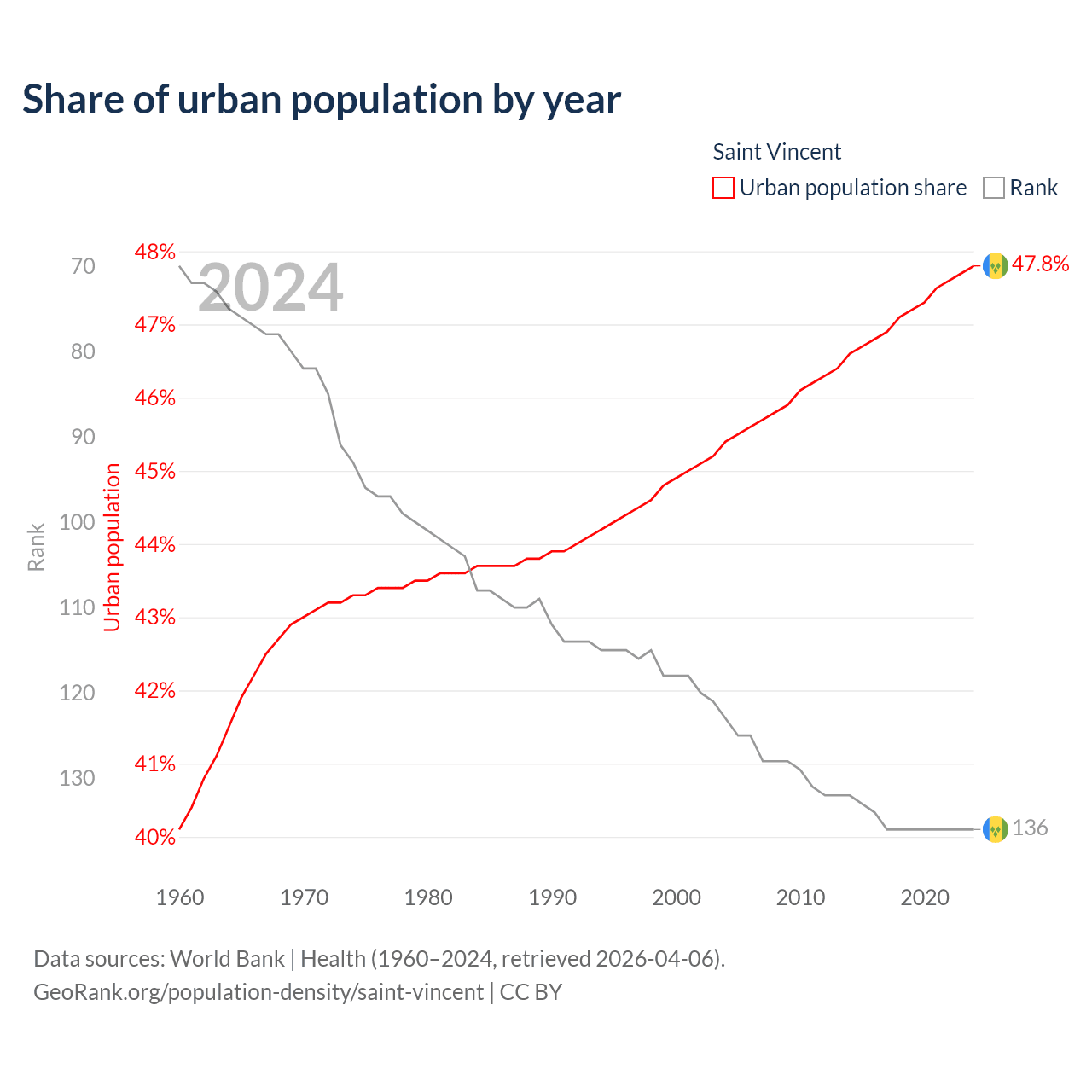 This chart shows the share of urban population in Saint Vincent from 1960 to 2024: 40.1% lived in urban areas in 1960, 44.9% in 2000, and 47.8% in 2024.