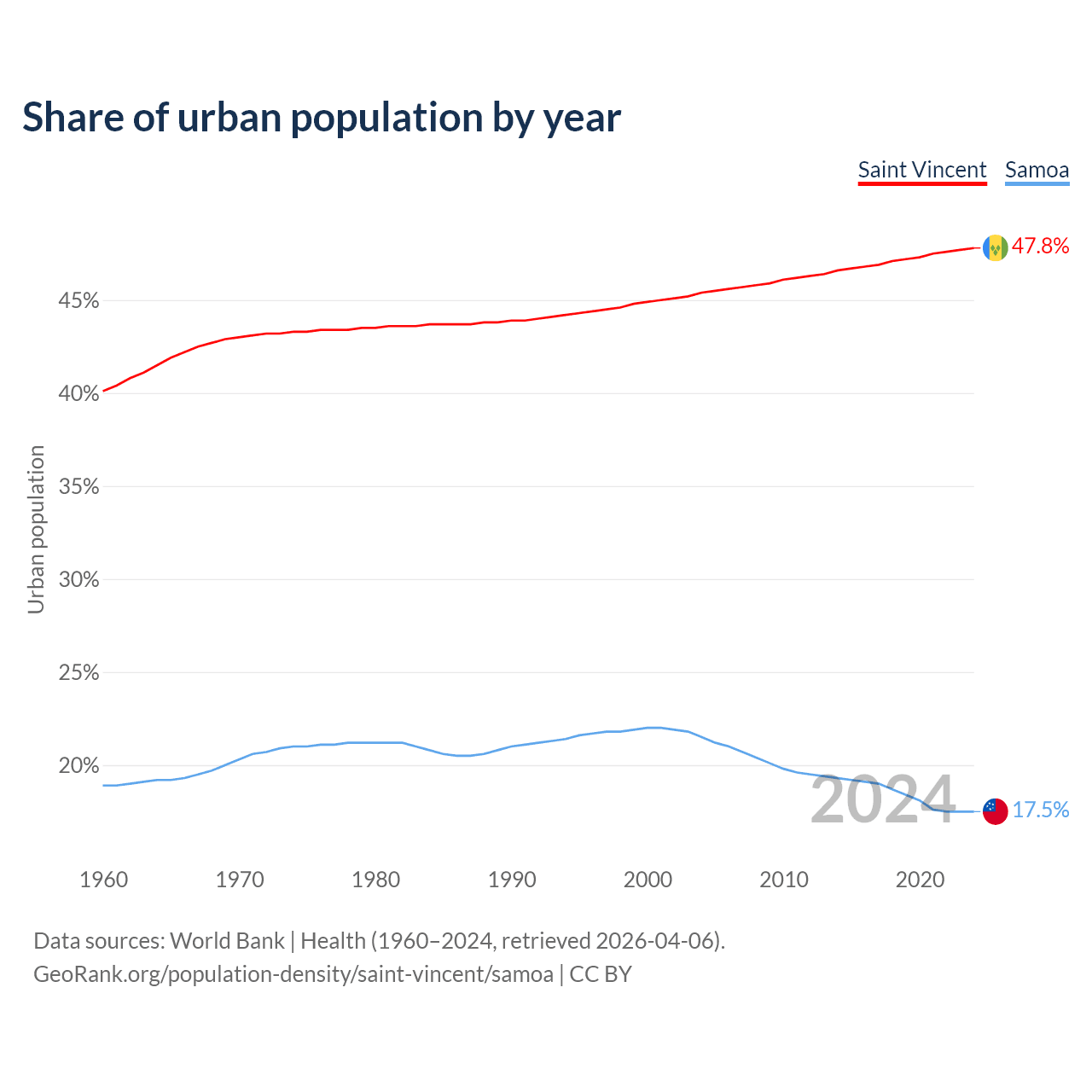 From 2004 to 2024, the share of urban population changed from 45.4% to 47.8% in Saint Vincent and from 21.5% to 17.5% in Samoa.