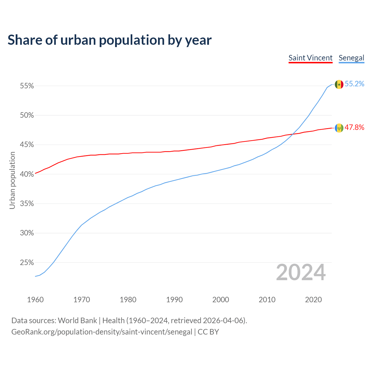 From 2004 to 2024, the share of urban population changed from 45.4% to 47.8% in Saint Vincent and from 41.6% to 55.2% in Senegal.