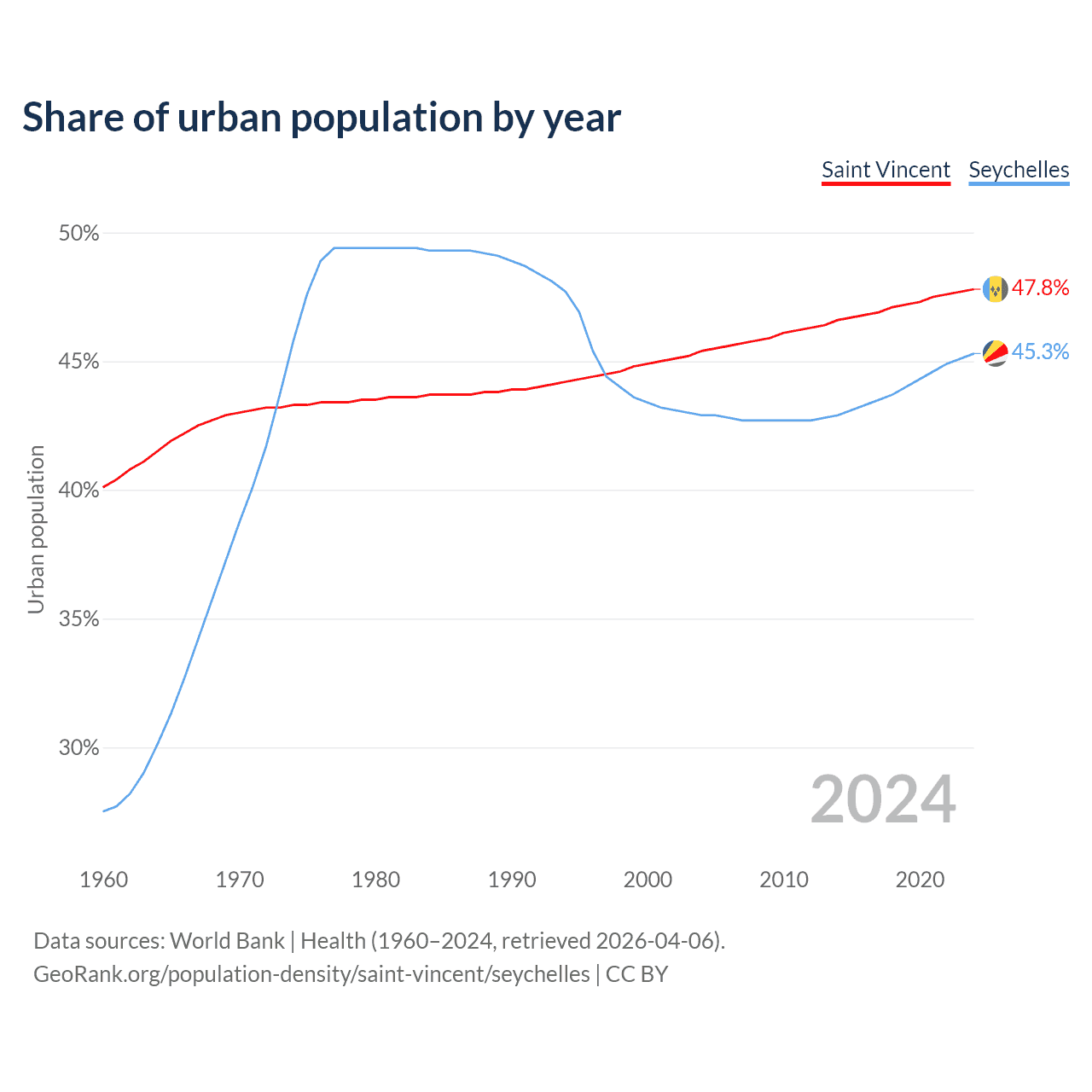 From 2004 to 2024, the share of urban population changed from 45.4% to 47.8% in Saint Vincent and from 42.9% to 45.3% in the Seychelles.