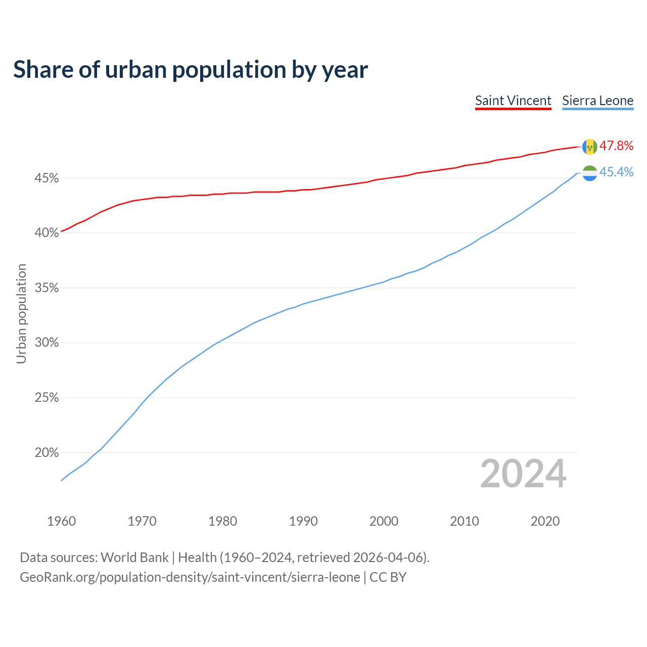 From 2004 to 2024, the share of urban population changed from 45.4% to 47.8% in Saint Vincent and from 36.5% to 45.4% in Sierra Leone.