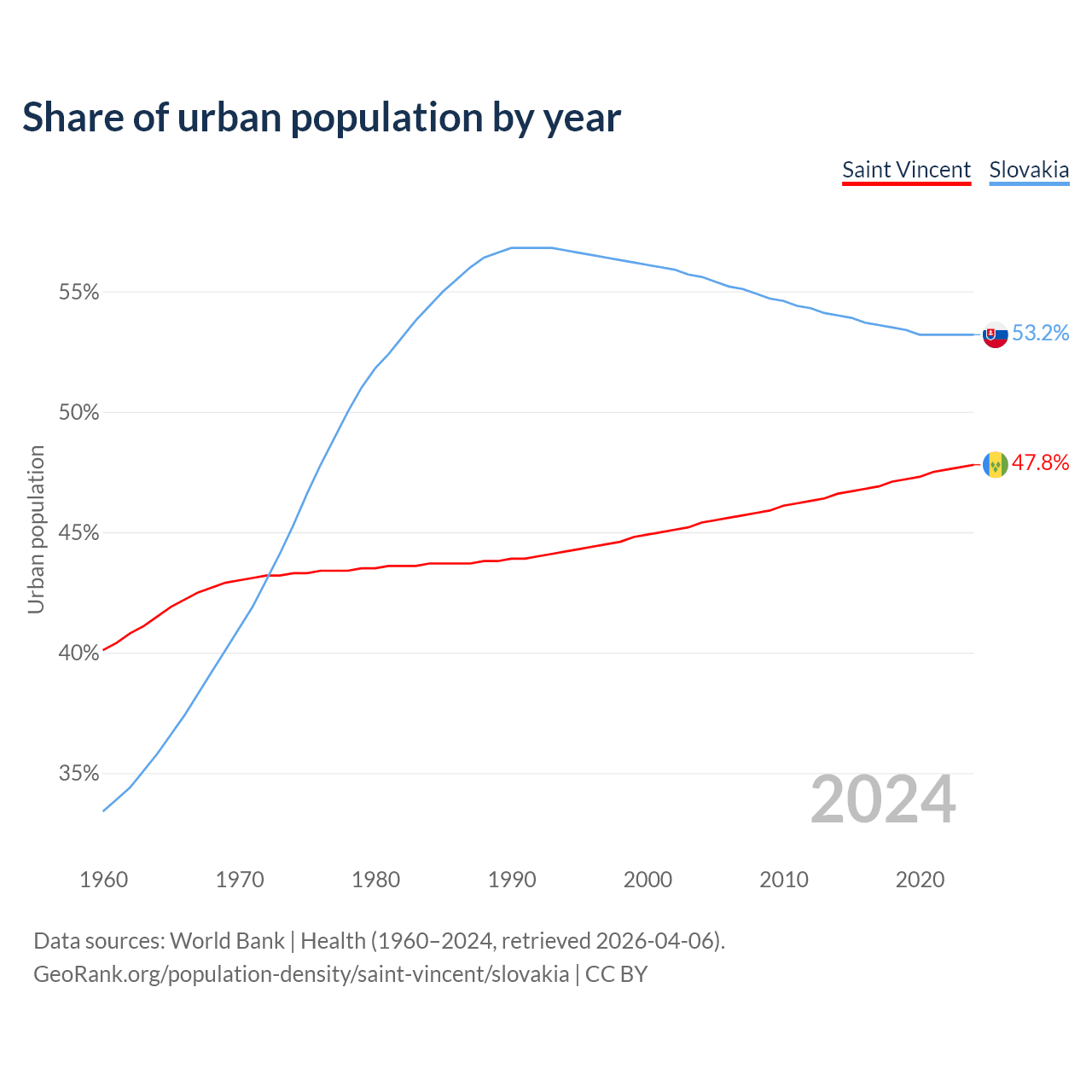 From 2004 to 2024, the share of urban population changed from 45.4% to 47.8% in Saint Vincent and from 55.6% to 53.2% in Slovakia.