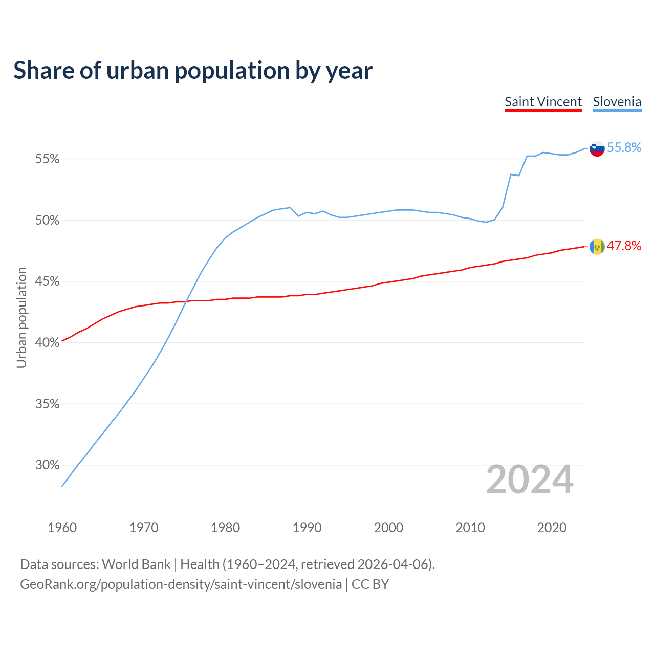 From 2004 to 2024, the share of urban population changed from 45.4% to 47.8% in Saint Vincent and from 50.7% to 55.8% in Slovenia.