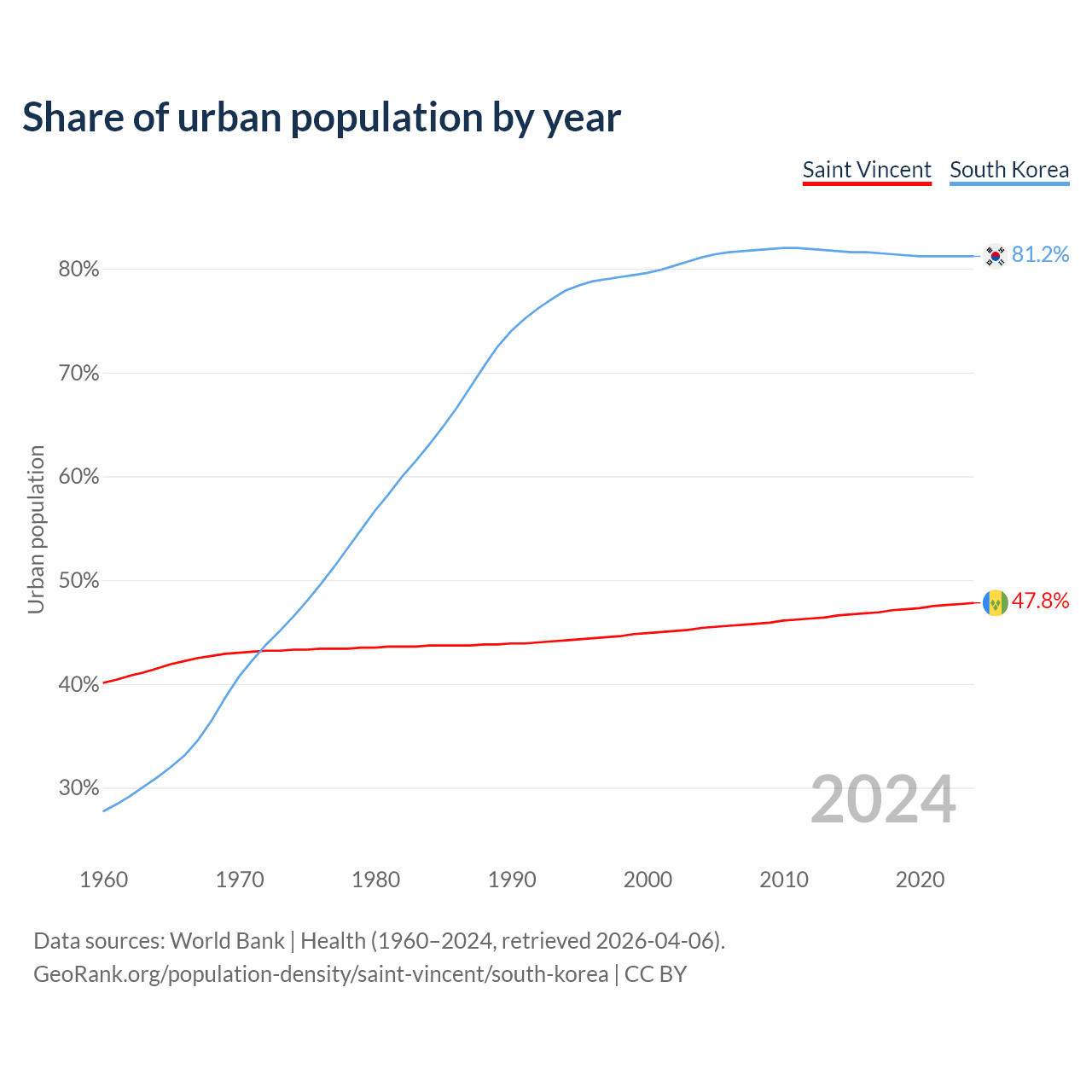 From 2004 to 2024, the share of urban population changed from 45.4% to 47.8% in Saint Vincent and from 81.1% to 81.2% in South Korea.
