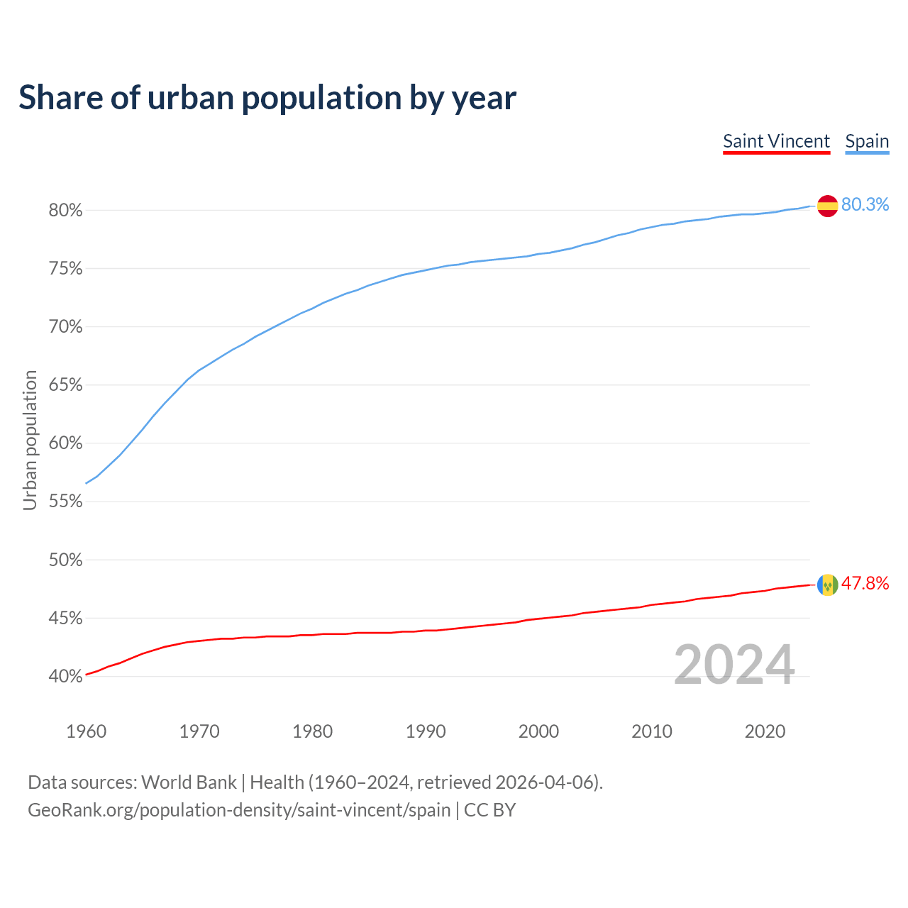 From 2004 to 2024, the share of urban population changed from 45.4% to 47.8% in Saint Vincent and from 77% to 80.3% in Spain.