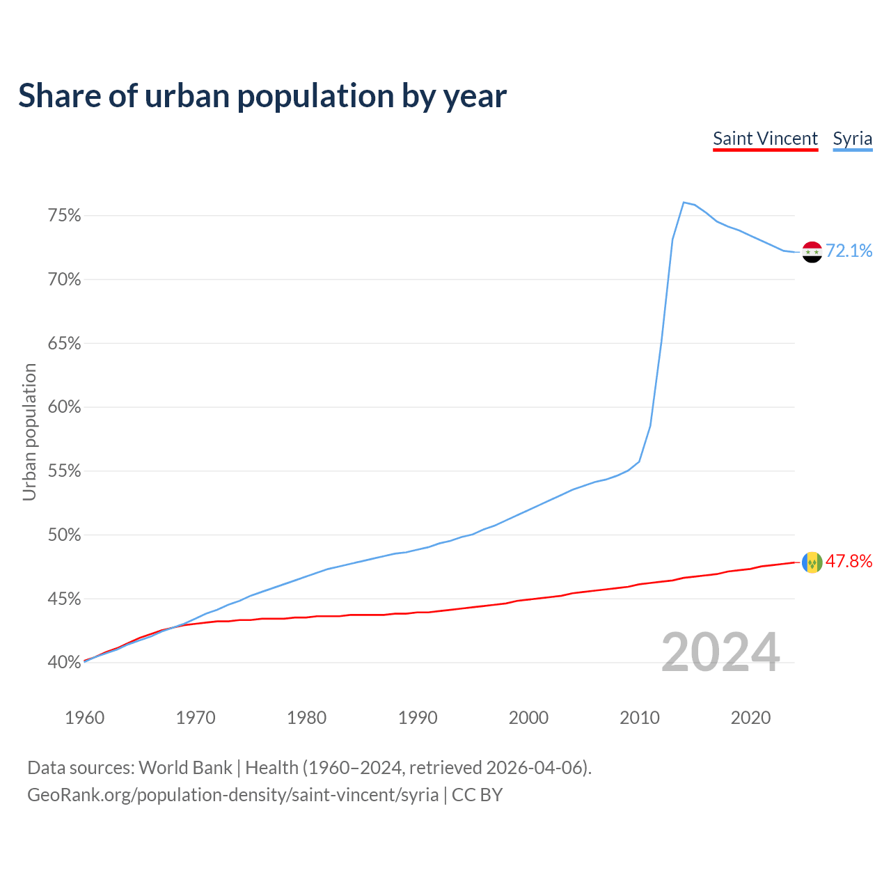 From 2004 to 2024, the share of urban population changed from 45.4% to 47.8% in Saint Vincent and from 53.5% to 72.1% in Syria.