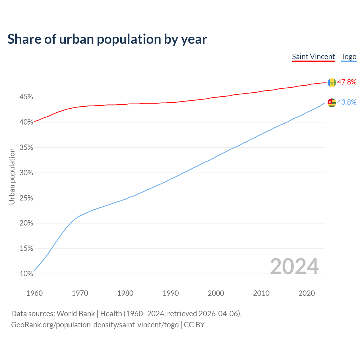 From 2004 to 2024, the share of urban population changed from 45.4% to 47.8% in Saint Vincent and from 34.9% to 43.8% in Togo.