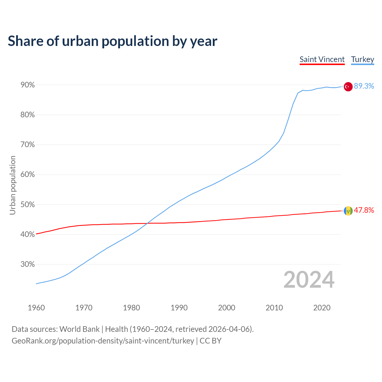 From 2004 to 2024, the share of urban population changed from 45.4% to 47.8% in Saint Vincent and from 62.4% to 89.3% in Turkey.
