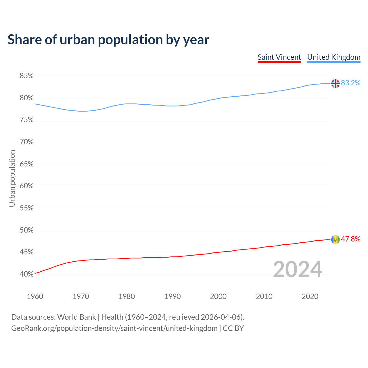 From 2004 to 2024, the share of urban population changed from 45.4% to 47.8% in Saint Vincent and from 80.3% to 83.2% in the United Kingdom.