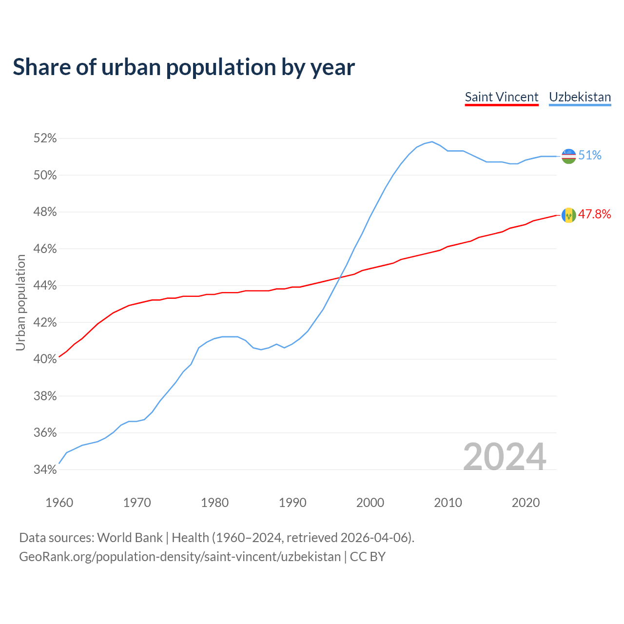 From 2004 to 2024, the share of urban population changed from 45.4% to 47.8% in Saint Vincent and from 50.6% to 51% in Uzbekistan.