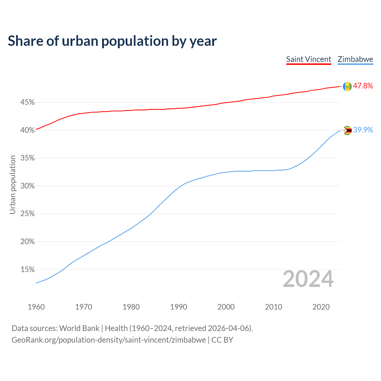 From 2004 to 2024, the share of urban population changed from 45.4% to 47.8% in Saint Vincent and from 32.6% to 39.9% in Zimbabwe.