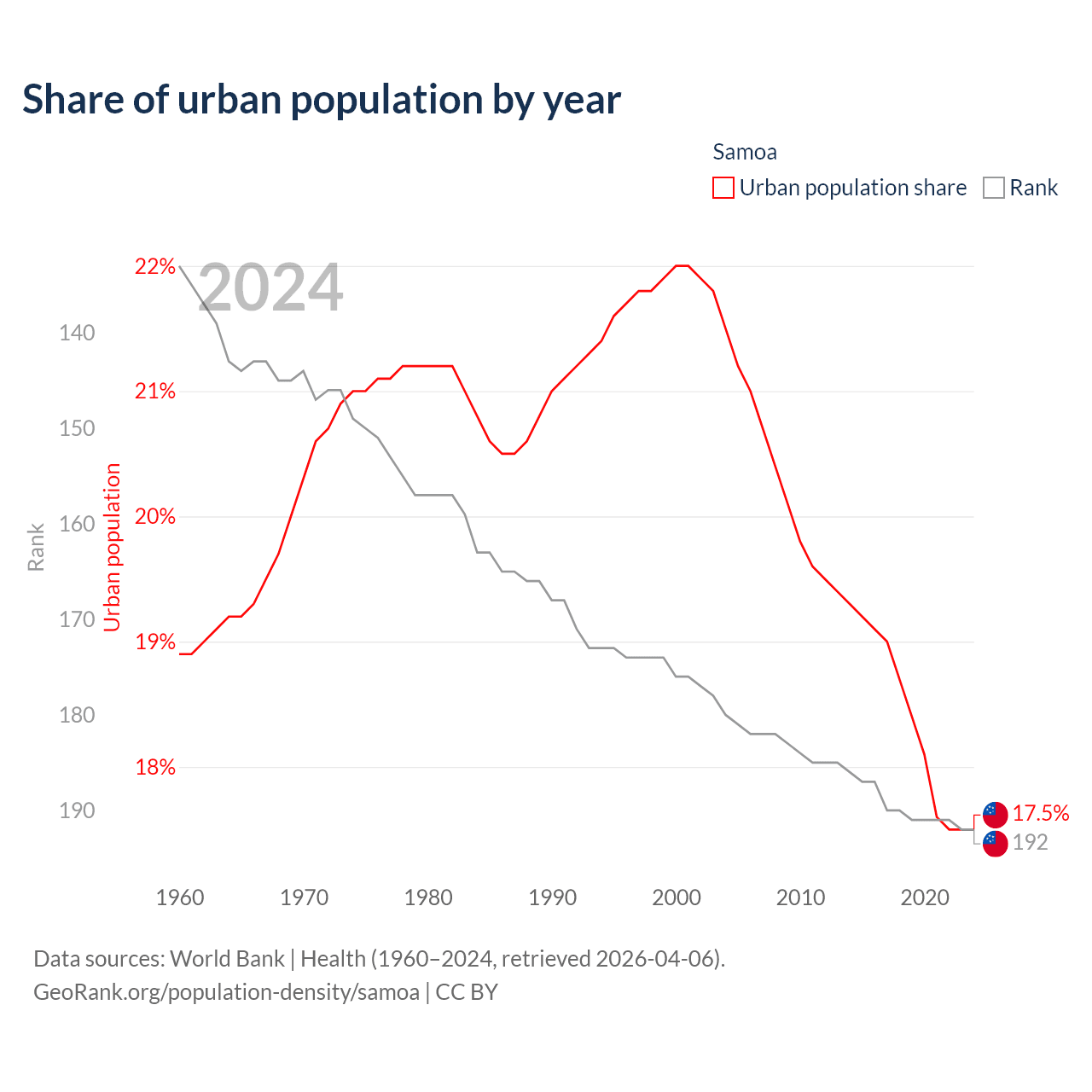 This chart shows the share of urban population in Samoa from 1960 to 2024: 18.9% lived in urban areas in 1960, 22% in 2000, and 17.5% in 2024.