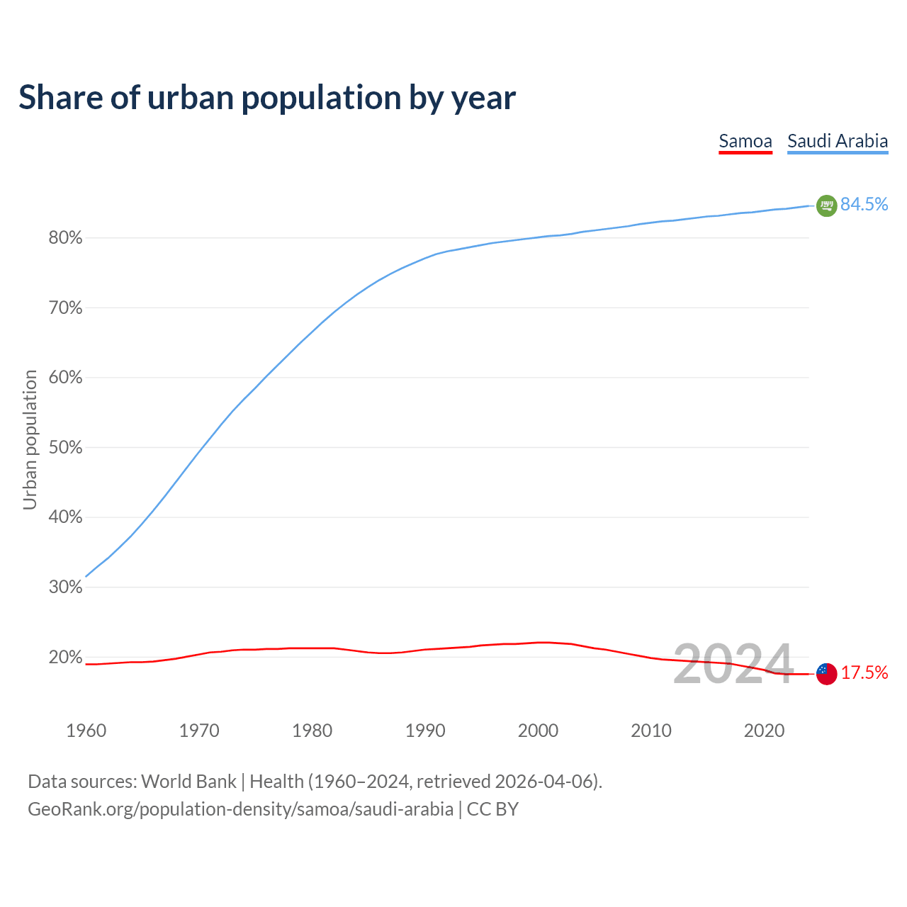From 2004 to 2024, the share of urban population changed from 21.5% to 17.5% in Samoa and from 80.8% to 84.5% in Saudi Arabia.