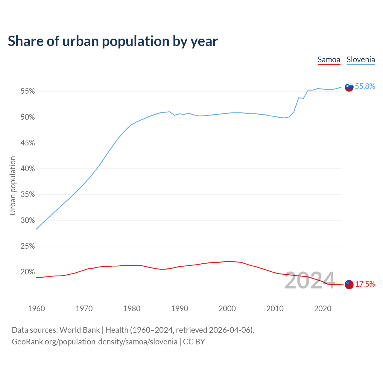 From 2004 to 2024, the share of urban population changed from 21.5% to 17.5% in Samoa and from 50.7% to 55.8% in Slovenia.