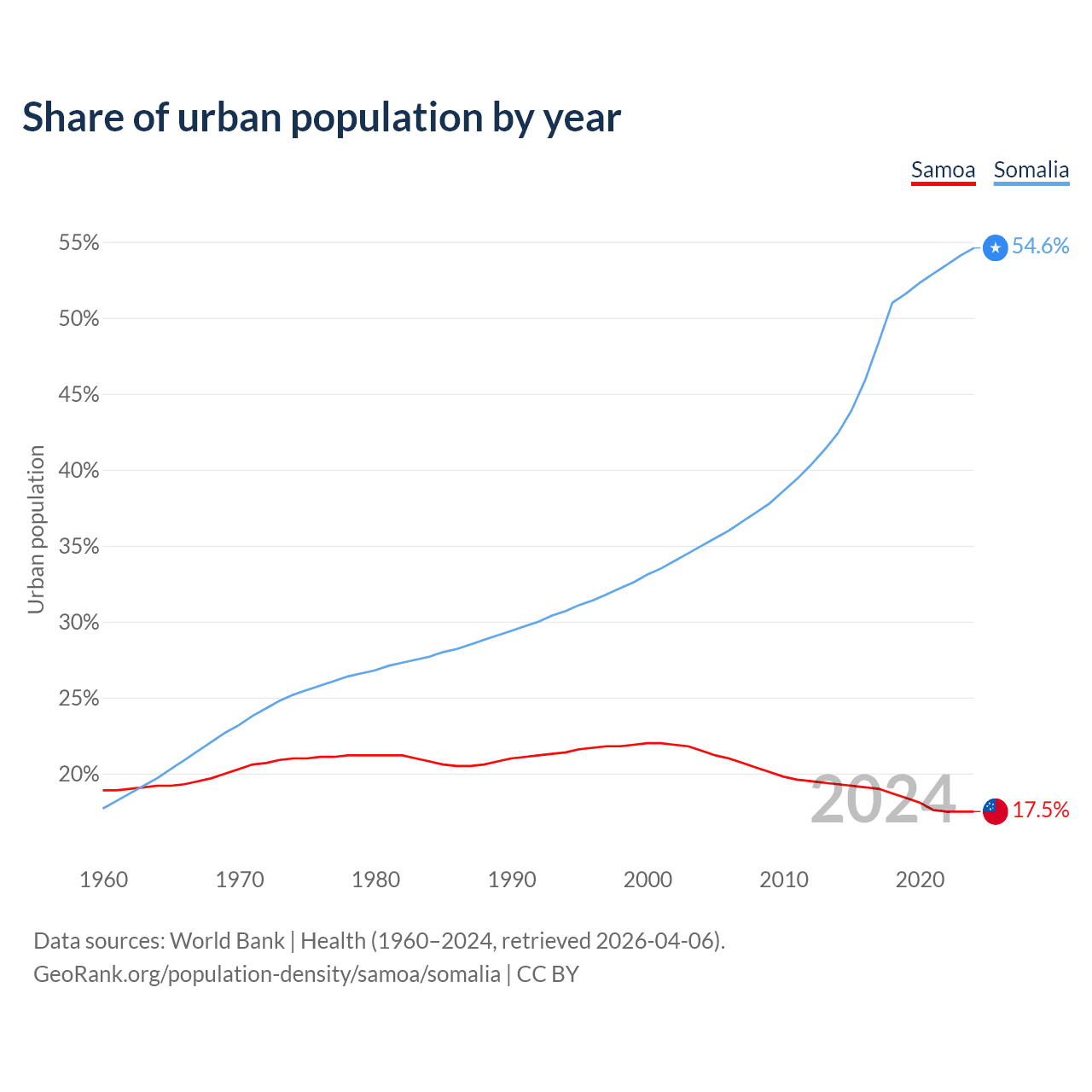 From 2004 to 2024, the share of urban population changed from 21.5% to 17.5% in Samoa and from 35% to 54.6% in Somalia.