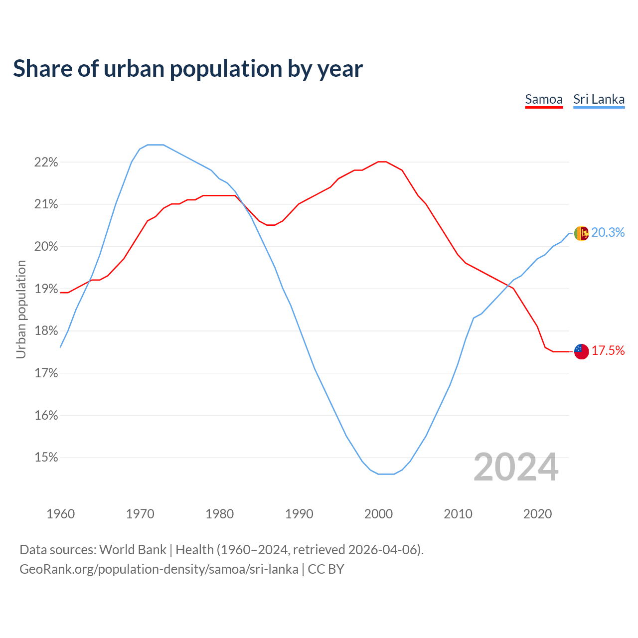 From 2006 to 2026, population density in Samoa increased by 19.6%, compared to a 10.4% growth in Sri Lanka.