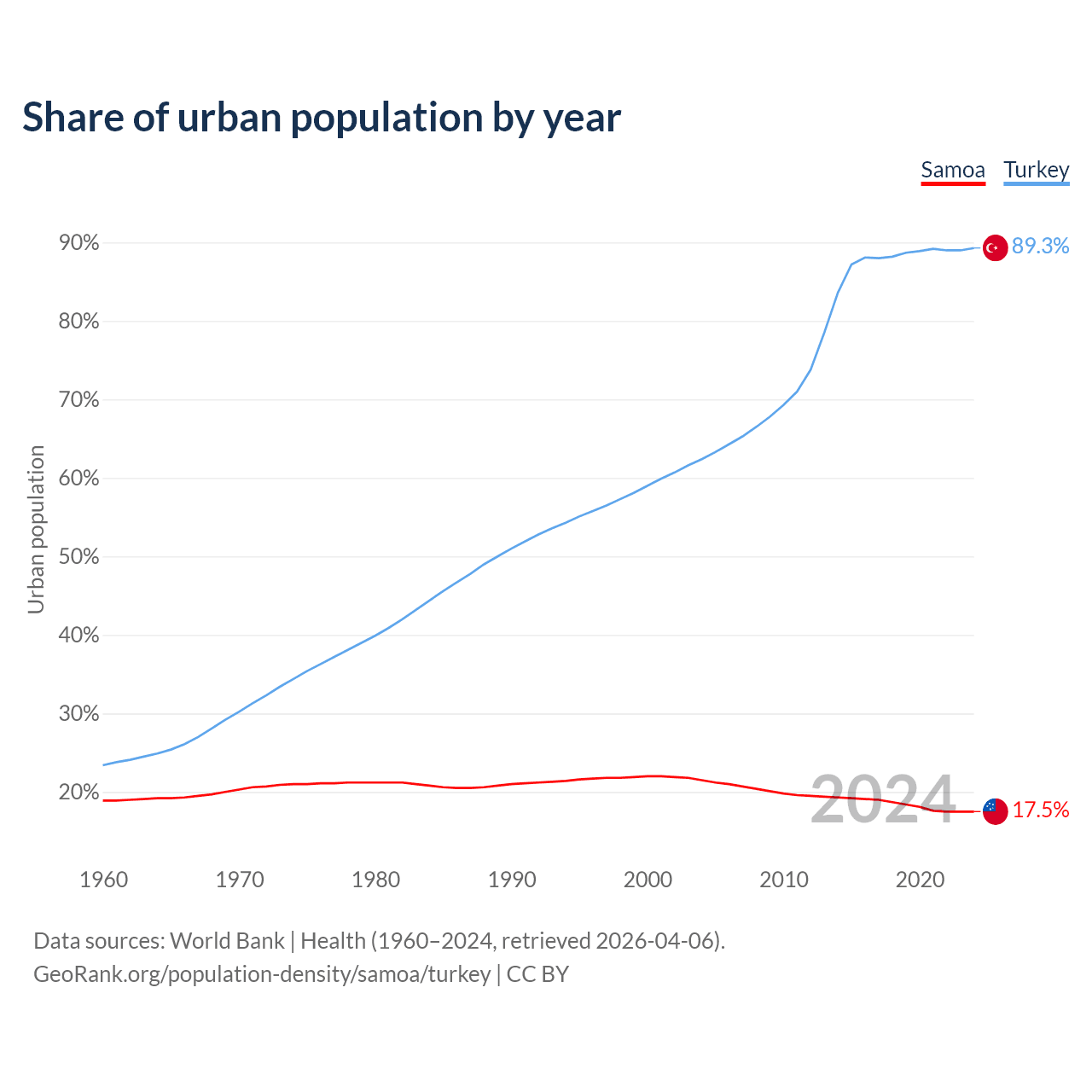 From 2006 to 2026, population density in Samoa increased by 19.6%, compared to a 22.7% growth in Turkey.