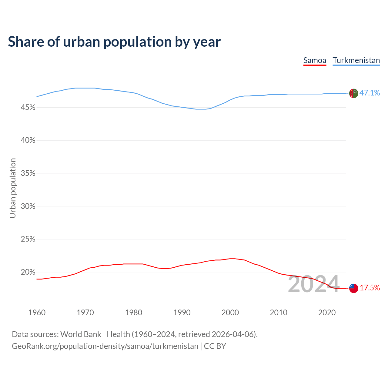 From 2004 to 2024, the share of urban population changed from 21.5% to 17.5% in Samoa and from 46.7% to 47.1% in Turkmenistan.