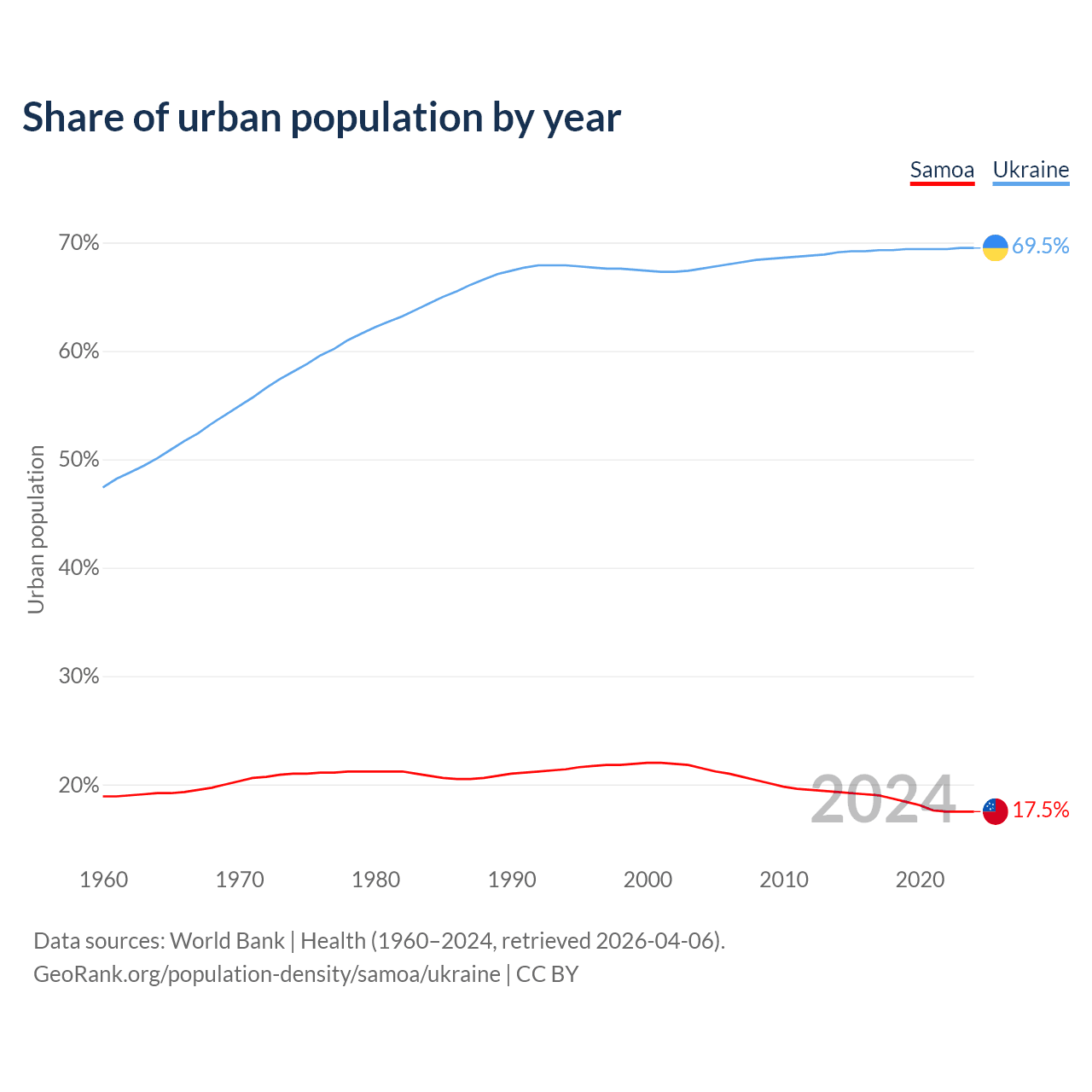From 2004 to 2024, the share of urban population changed from 21.5% to 17.5% in Samoa and from 67.6% to 69.5% in Ukraine.