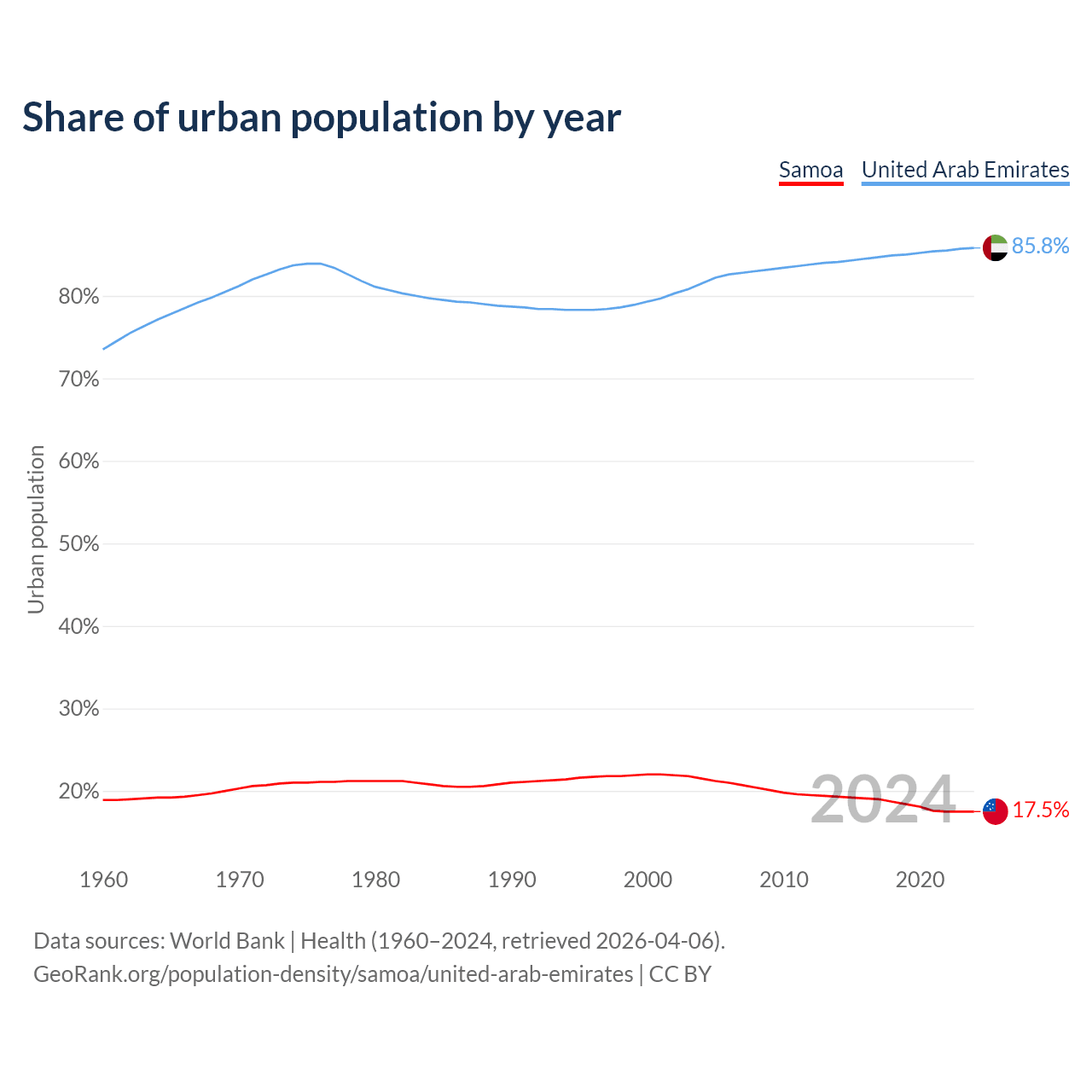 From 2004 to 2024, the share of urban population changed from 21.5% to 17.5% in Samoa and from 81.5% to 85.8% in the United Arab Emirates.
