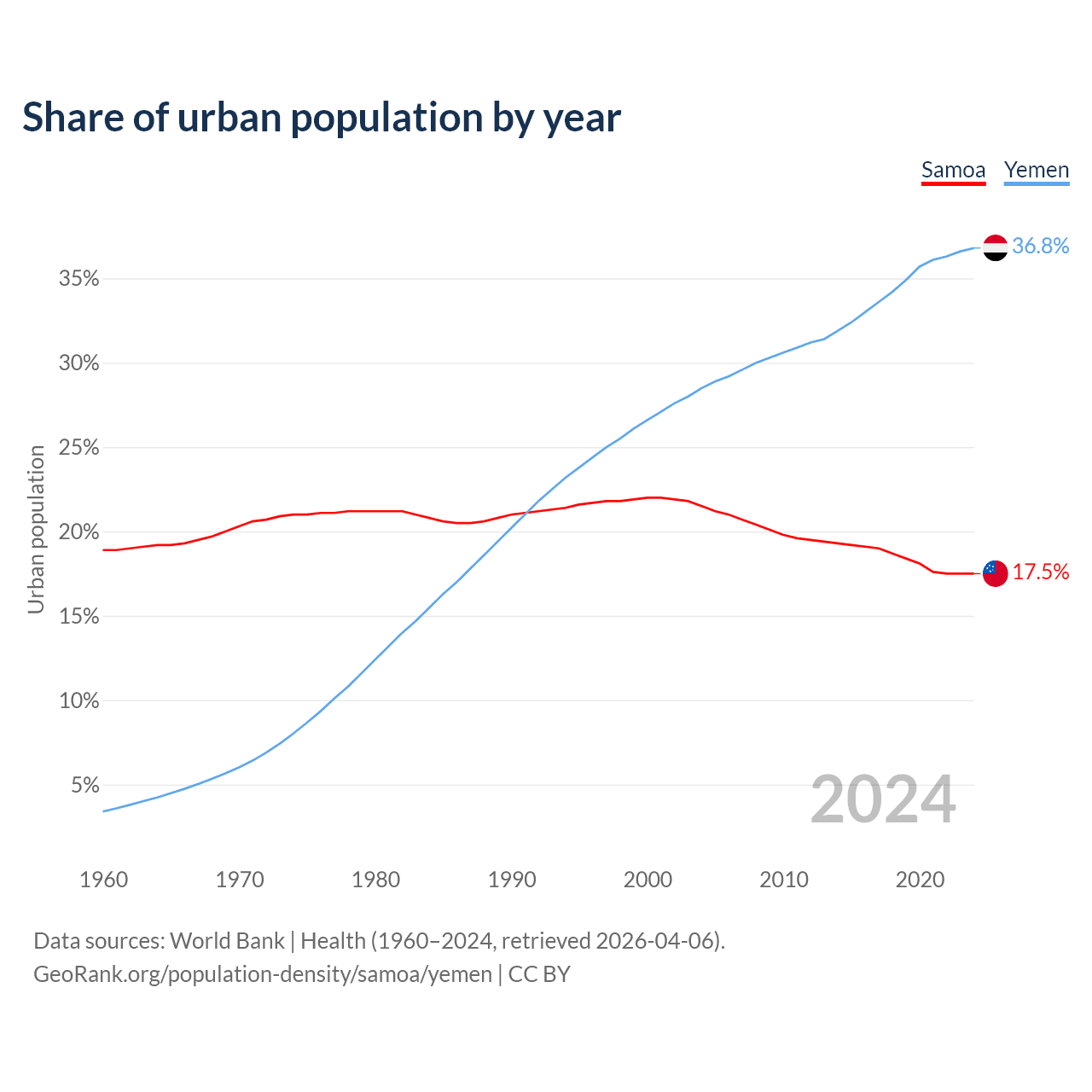 From 2004 to 2024, the share of urban population changed from 21.5% to 17.5% in Samoa and from 28.5% to 36.8% in Yemen.