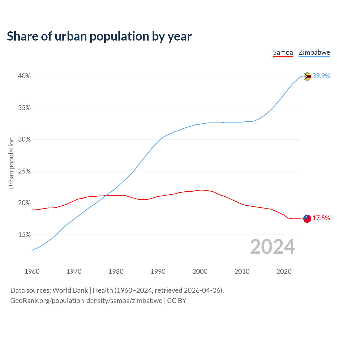 From 2004 to 2024, the share of urban population changed from 21.5% to 17.5% in Samoa and from 32.6% to 39.9% in Zimbabwe.