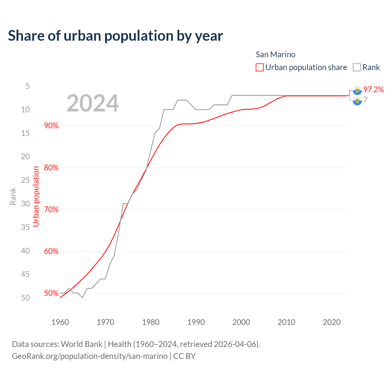 This chart shows the share of urban population in San Marino from 1960 to 2024: 48.9% lived in urban areas in 1960, 93.8% in 2000, and 97.2% in 2024.