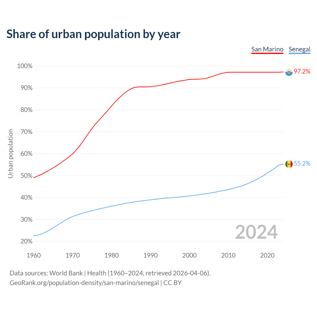 From 2004 to 2024, the share of urban population changed from 94.2% to 97.2% in San Marino and from 41.6% to 55.2% in Senegal.