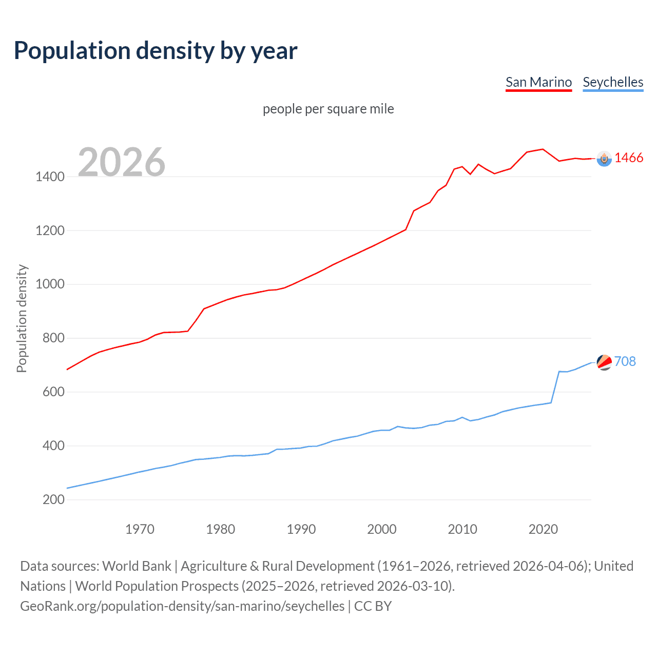 From 2006 to 2026, population density in San Marino increased by 12.5%, compared to a 48.7% growth in the Seychelles.