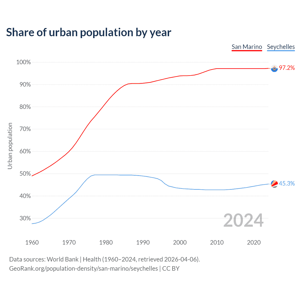 From 2004 to 2024, the share of urban population changed from 94.2% to 97.2% in San Marino and from 42.9% to 45.3% in the Seychelles.
