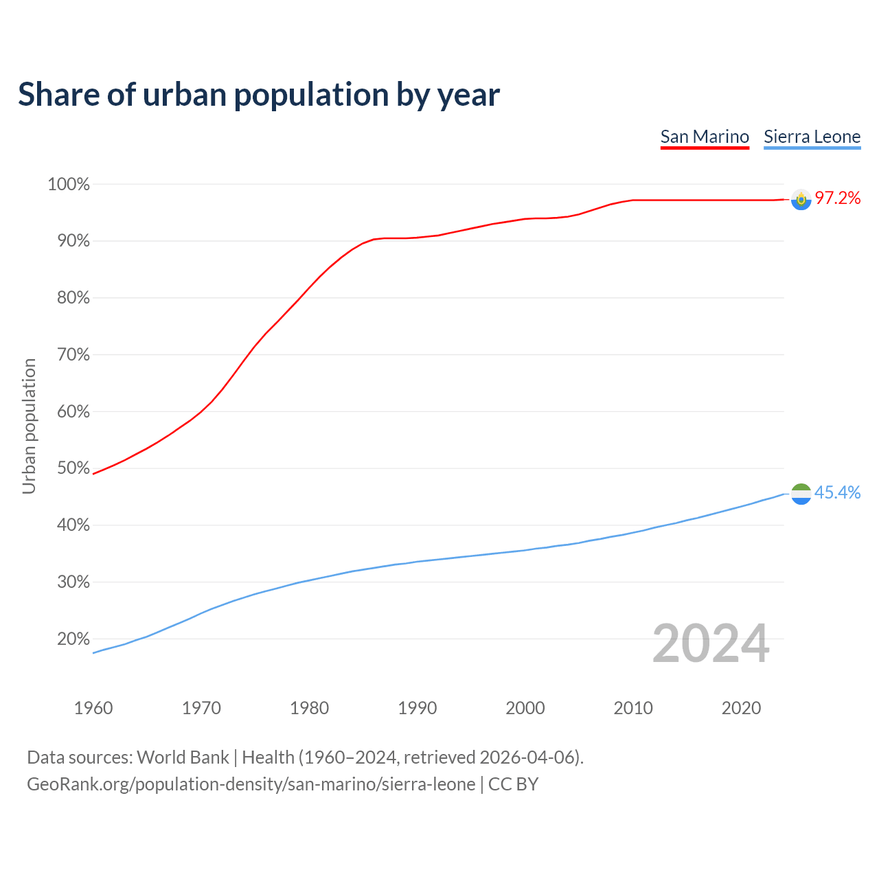 From 2004 to 2024, the share of urban population changed from 94.2% to 97.2% in San Marino and from 36.5% to 45.4% in Sierra Leone.