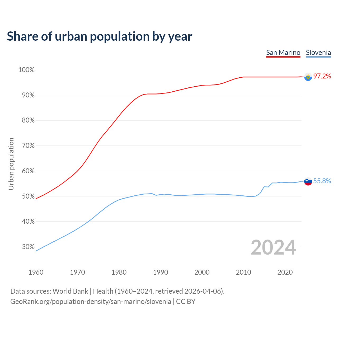 From 2004 to 2024, the share of urban population changed from 94.2% to 97.2% in San Marino and from 50.7% to 55.8% in Slovenia.