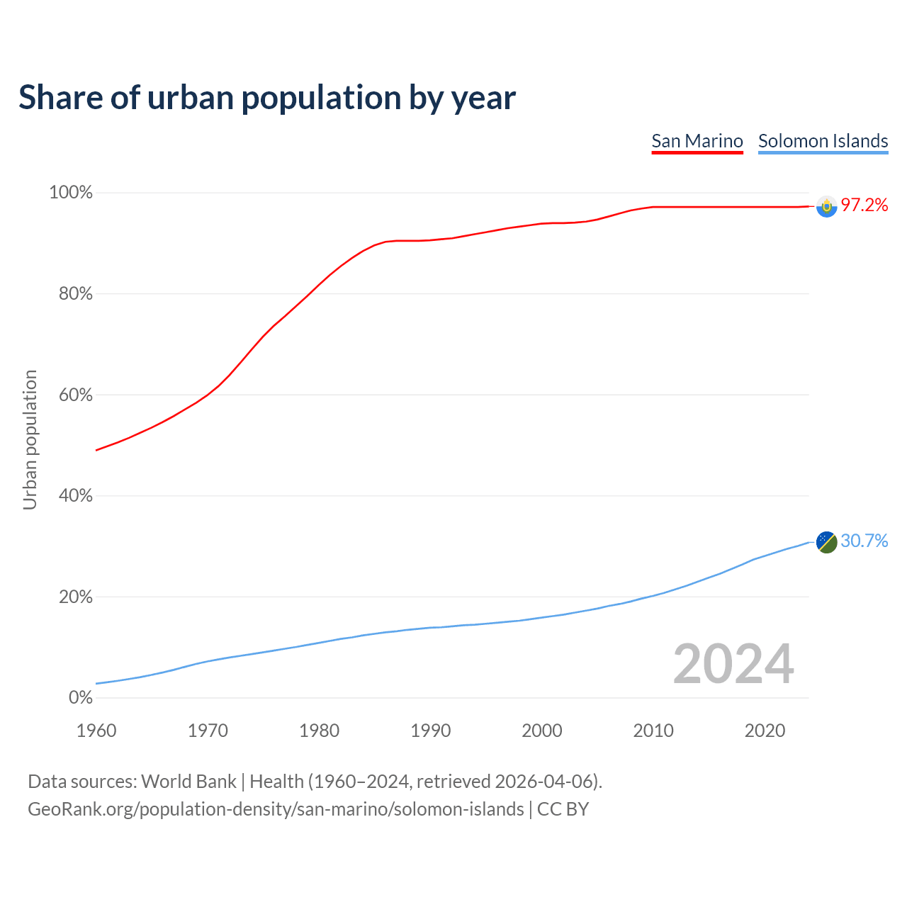 From 2004 to 2024, the share of urban population changed from 94.2% to 97.2% in San Marino and from 17.2% to 30.7% in the Solomon Islands.