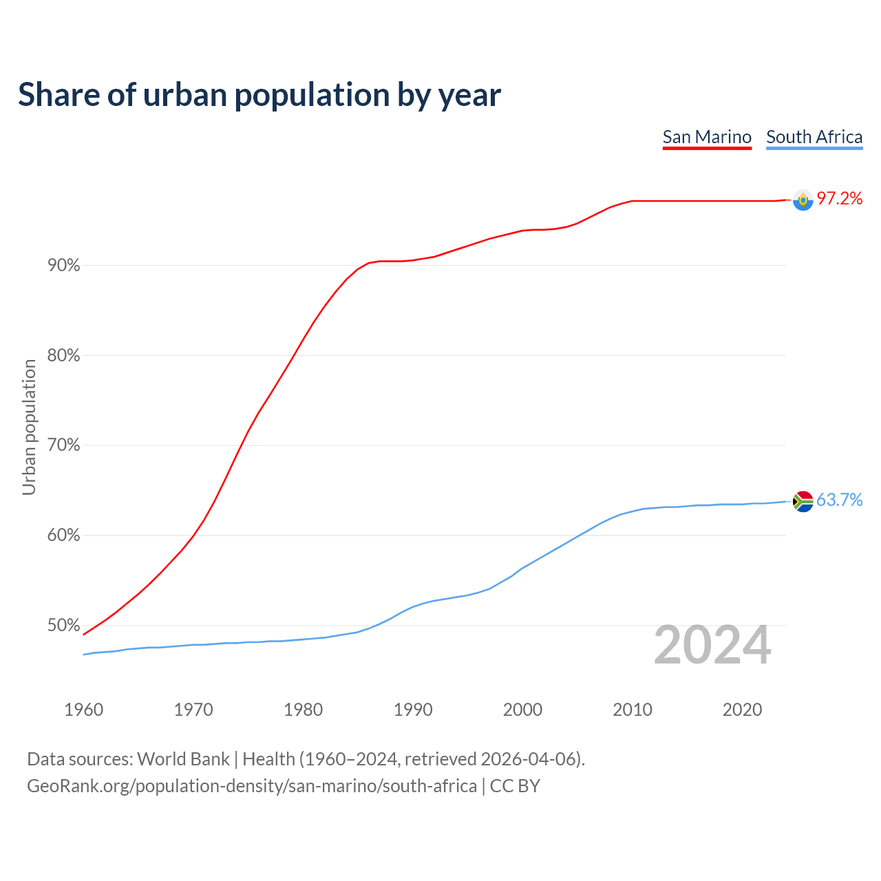 From 2004 to 2024, the share of urban population changed from 94.2% to 97.2% in San Marino and from 59.1% to 63.7% in South Africa.