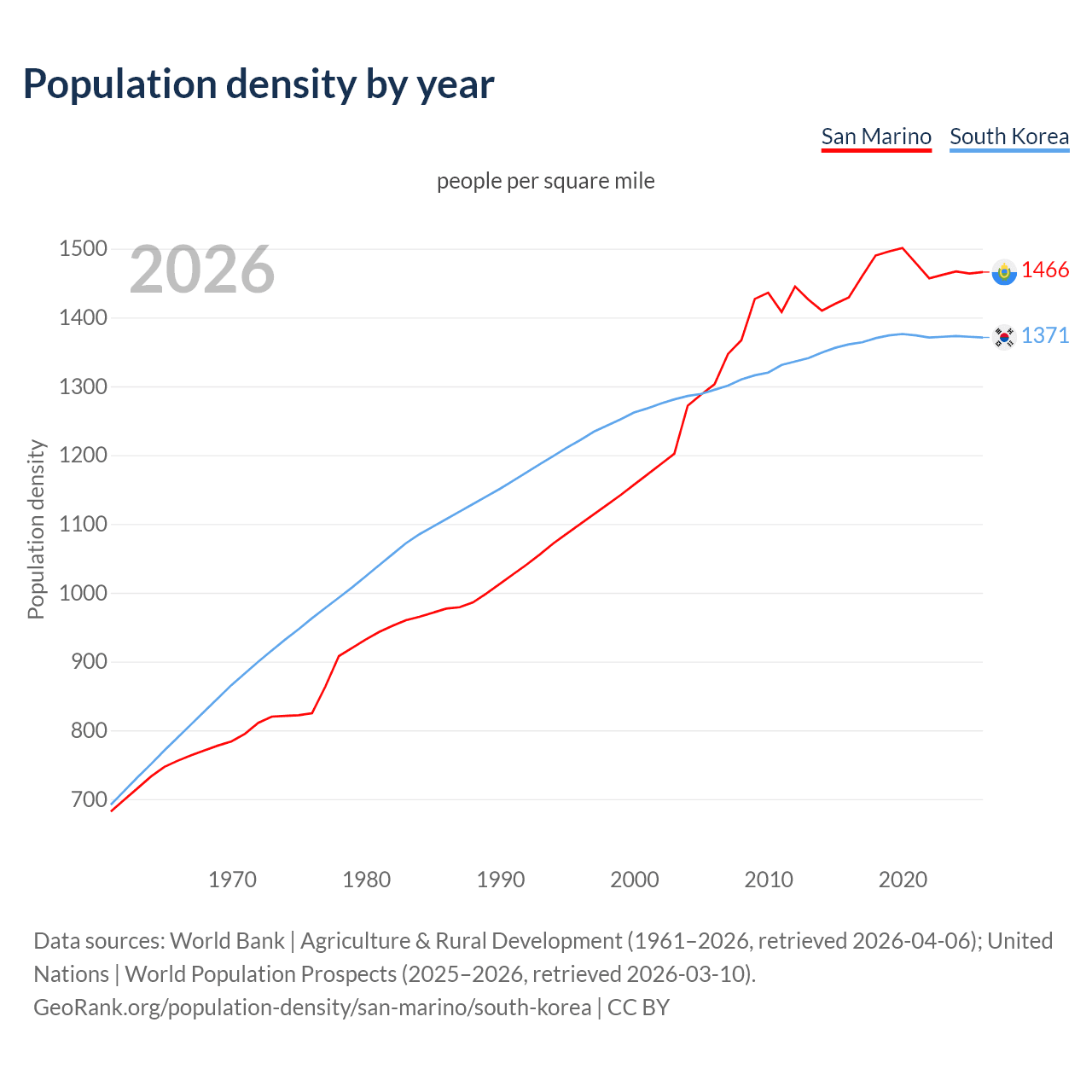 From 2006 to 2026, population density in San Marino increased by 12.5%, compared to a 5.84% growth in South Korea.