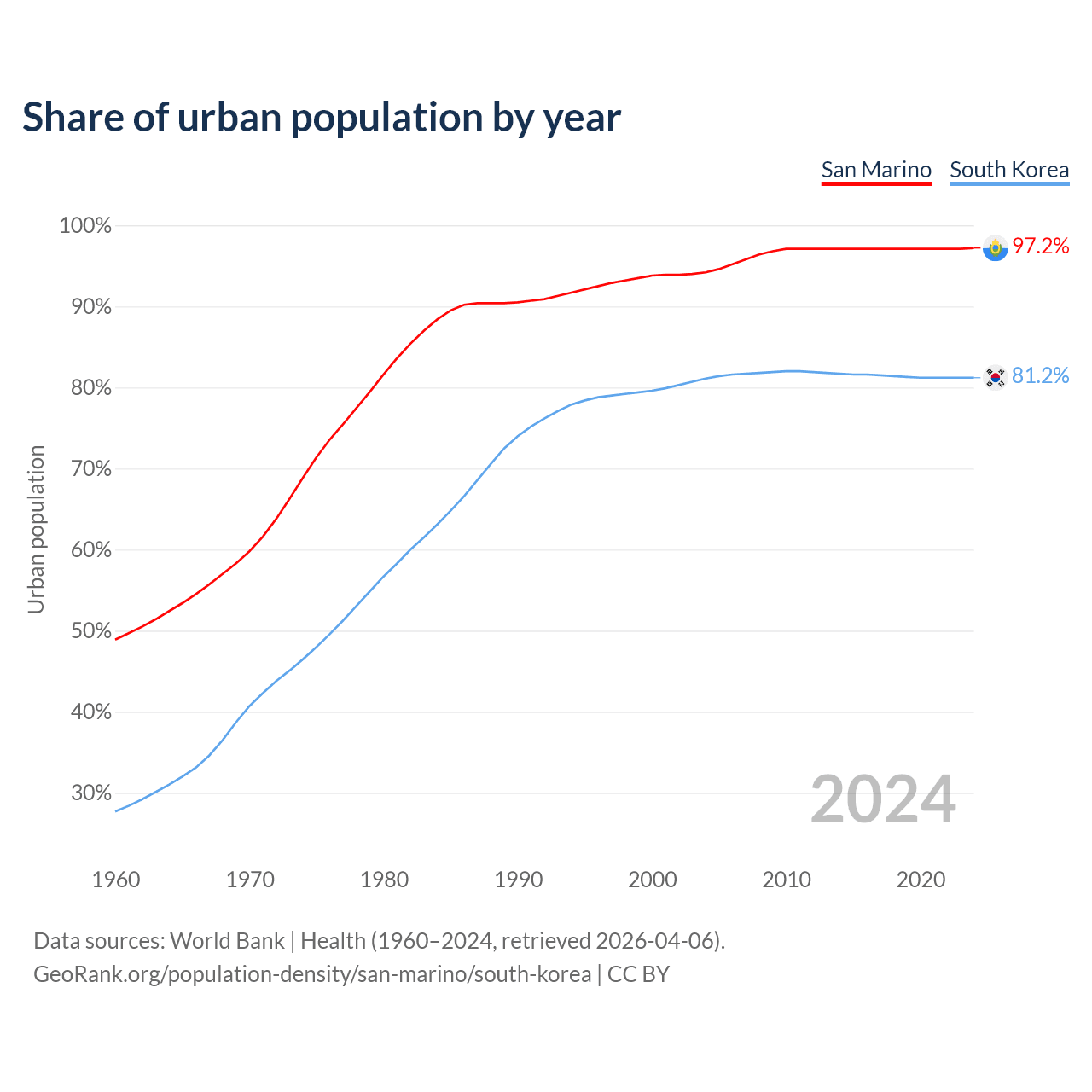 From 2004 to 2024, the share of urban population changed from 94.2% to 97.2% in San Marino and from 81.1% to 81.2% in South Korea.