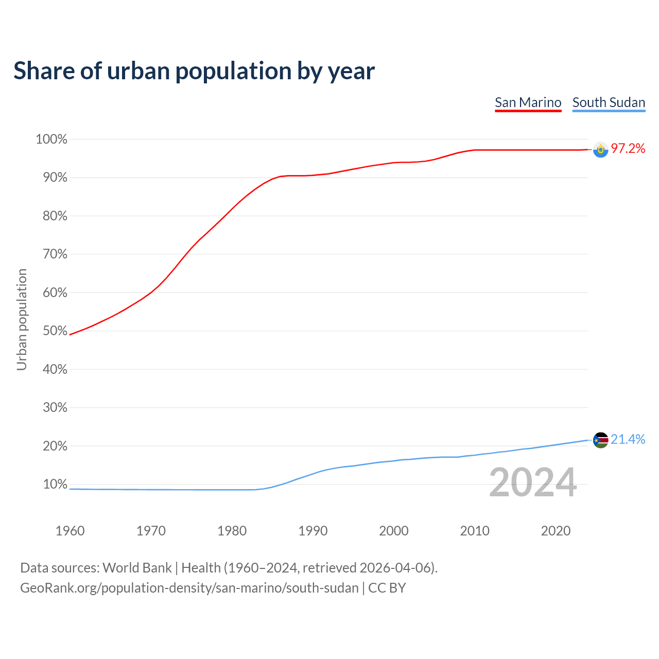 From 2004 to 2024, the share of urban population changed from 94.2% to 97.2% in San Marino and from 16.8% to 21.4% in South Sudan.